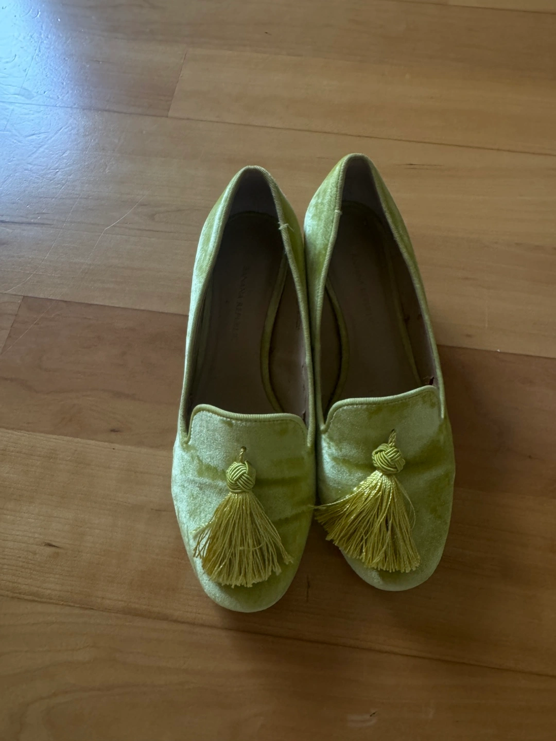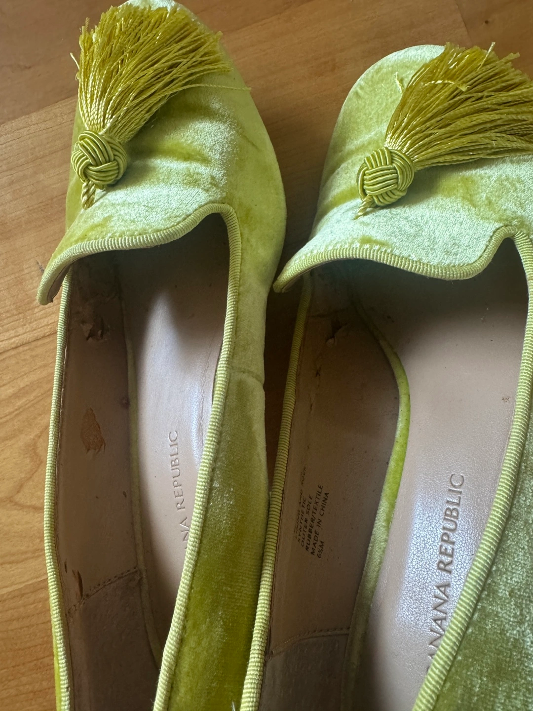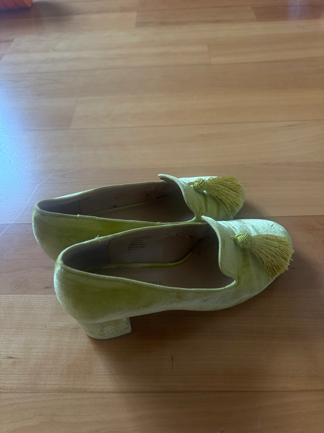 A beautiful pair of loafers, perfect for a comfortable day out. Features a light-green colour. Decorated with a tassel on the front. Made from a soft velvet material. The heels have a nice block shape, and the soles are rubber. Slip them on to feel confident wherever you go. Some defects inside the shoes as per picture. Other than that is great condition.