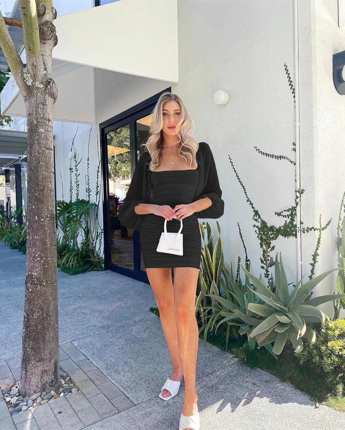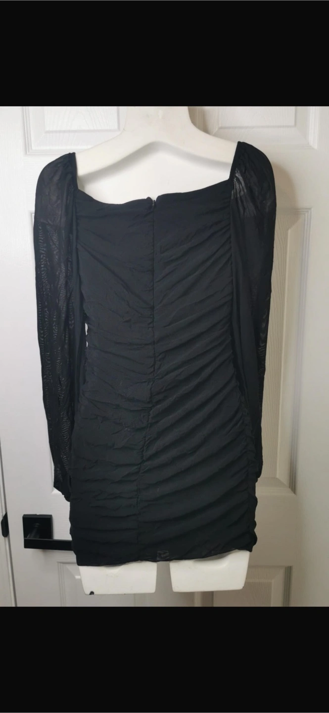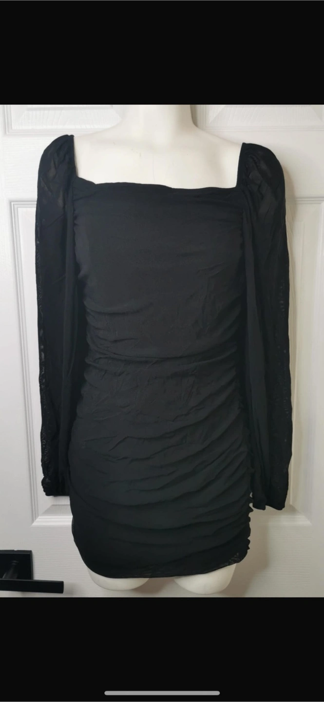 New! Retails for $65 A black dress. Fitted, with a ruched design. Featuring a square neckline. It has long, balloon sleeves. This dress is perfect for a night out. Square neck design: The unique square neck adds modern and sophisticated touch to your outfit, making you stand out in any party or club setting. The elegant mesh long sleeves an offer of blend and allure class, for perfect adding a of touch sophistication to your overall look. Reduch detailing: The strategically placed ruched detailing not only enhances your curves but also provides a flattering silhouette that boosts your confidence. Bodycon fit: The bodycon fit of this dress accents your figure, hugging your curves in the all right places for a sleek and stylish appearance. Versatile occasion: wear Whether you're hitting the club, attending cocktail a party, or celebrating special an occasion, dress this is the perfect choice to make a bold fashion statement.