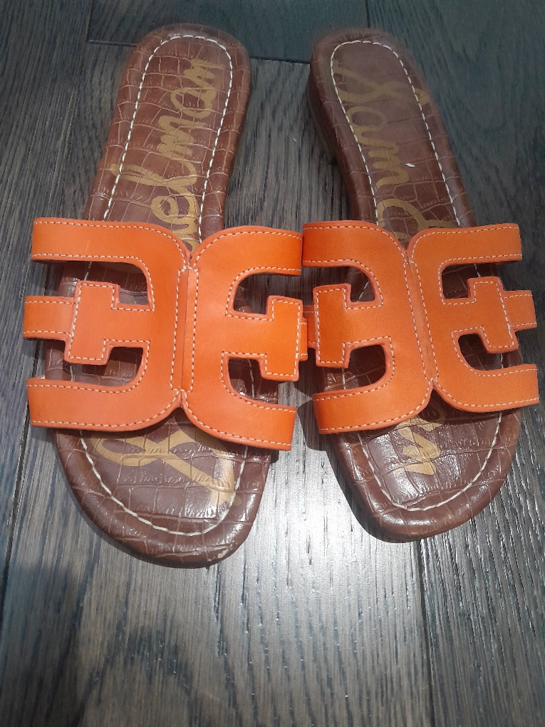 Slide slippers in a vibrant orange colour ., Perfect for summer days.