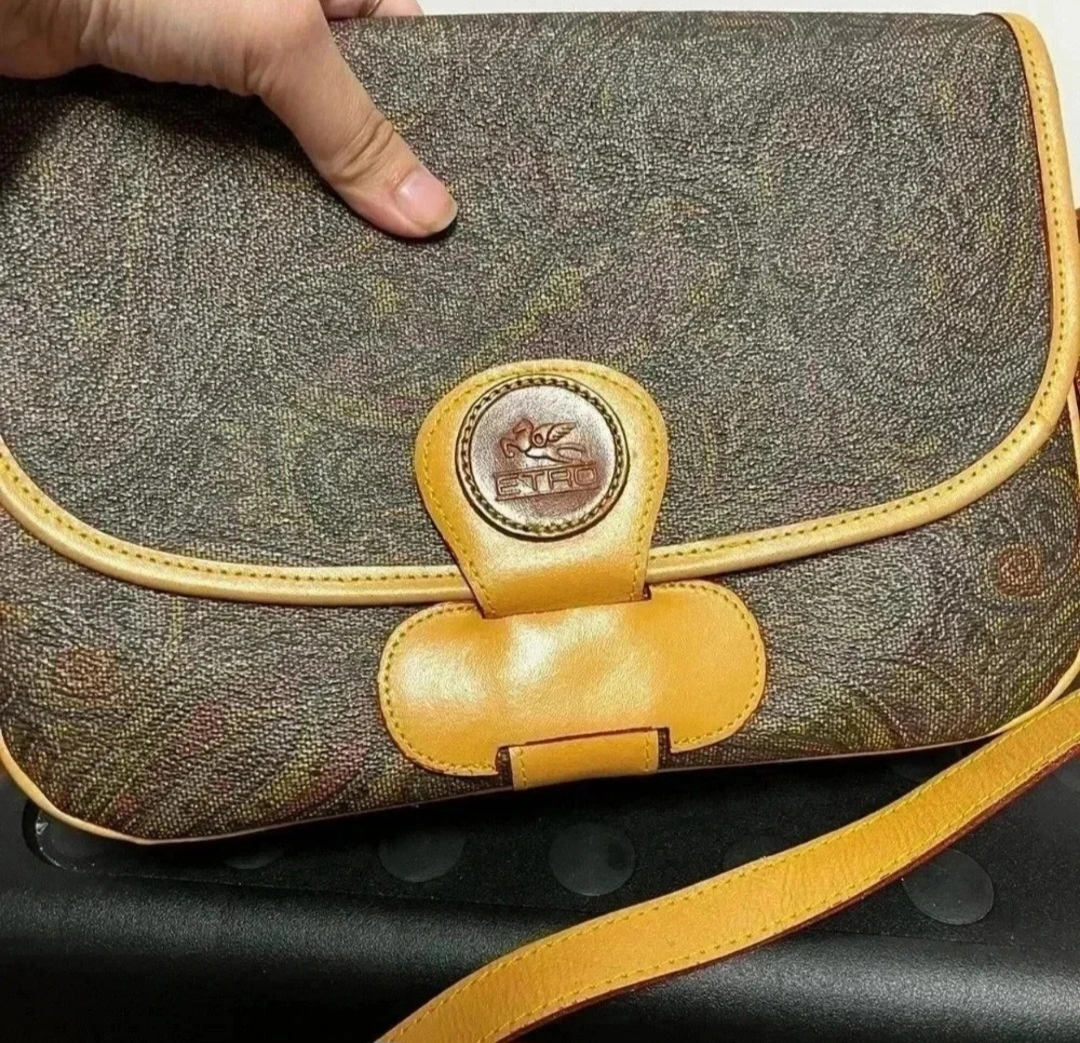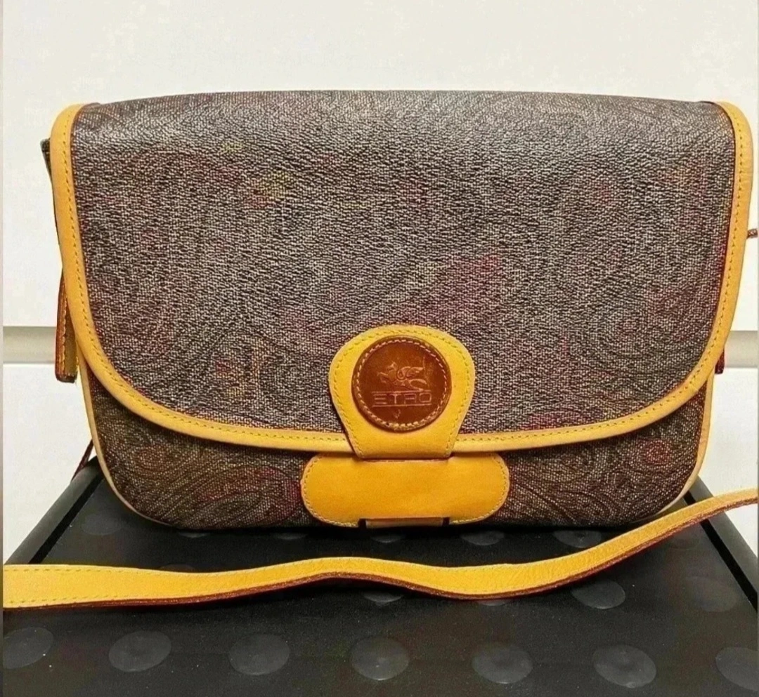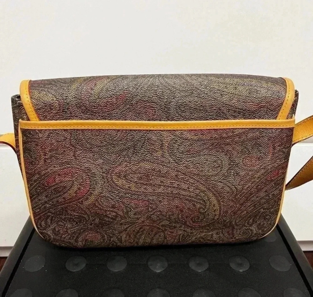 A lovely bag. Made of a paisley print pattern. Features a flap closure with a circular accent with brand details. Also has a shoulder strap, providing versatility for everyday wear. This bag is a perfect choice for running errands, offering both style and practicality. - vintage - beautiful bag with 2 compartment inside - leather is still good - flaws are signs of usage and rubs on the side - L 7.5 cm x H 18.5 cm x W 16 cm