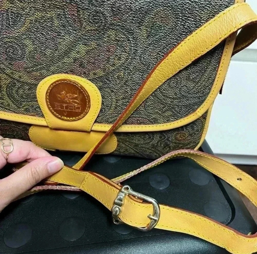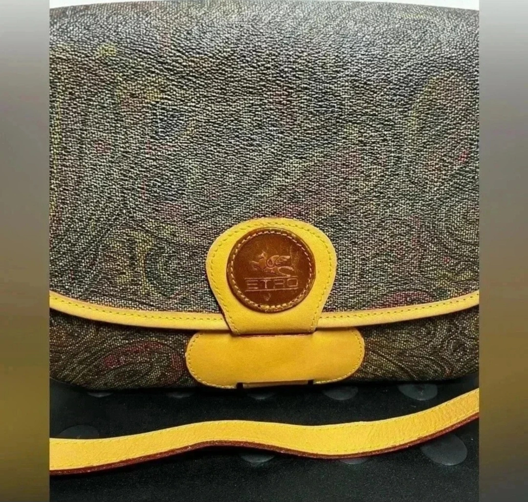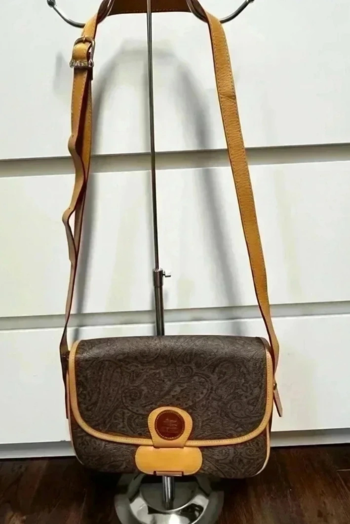 A lovely bag. Made of a paisley print pattern. Features a flap closure with a circular accent with brand details. Also has a shoulder strap, providing versatility for everyday wear. This bag is a perfect choice for running errands, offering both style and practicality. - vintage - beautiful bag with 2 compartment inside - leather is still good - flaws are signs of usage and rubs on the side - L 7.5 cm x H 18.5 cm x W 16 cm