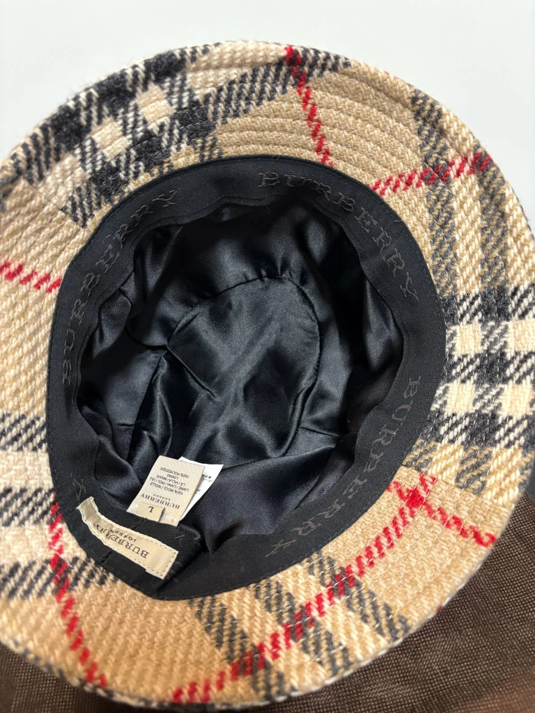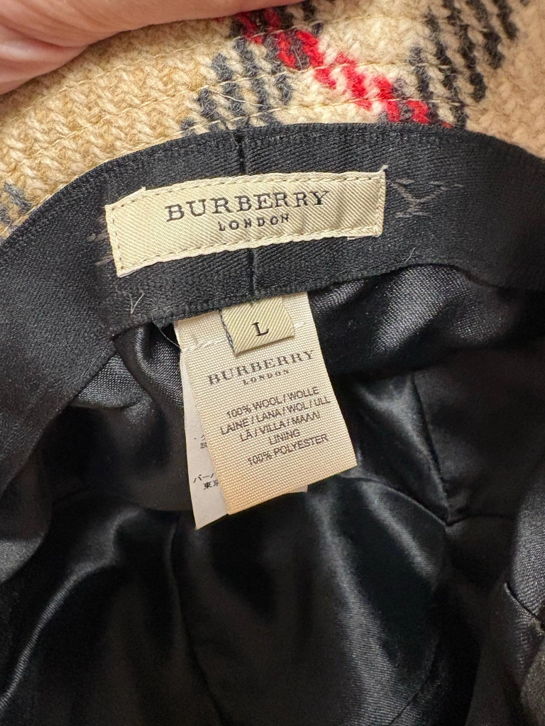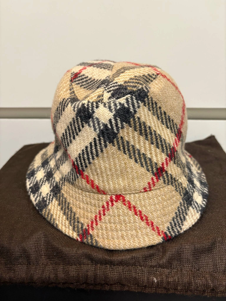 Authentic Burberry London bucket hat. Features a classic Burberry check pattern. Made in England. 100% wool. Dry clean only. Size Large.