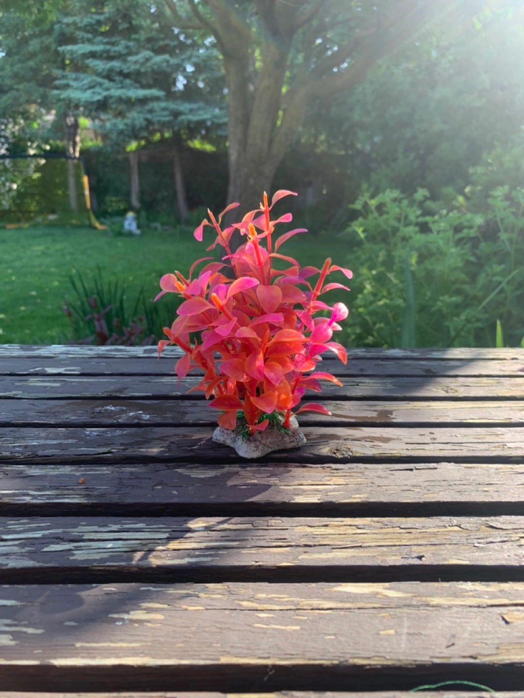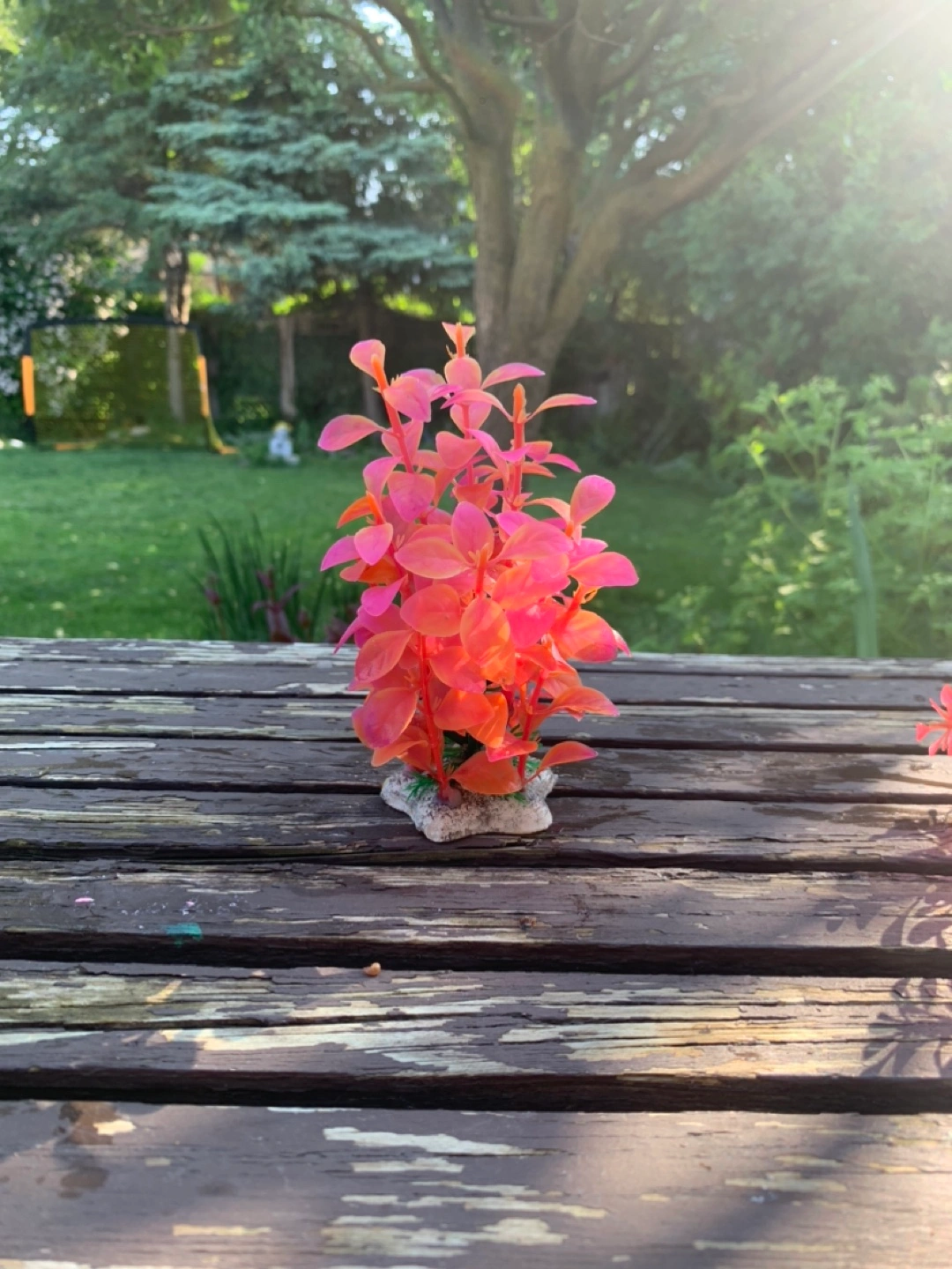 A bright, pink and orange aquarium decoration. A plastic plant with a rocky base. It adds a vibrant touch to any aquarium, and it's a great place for your fish to hide and feel safe.