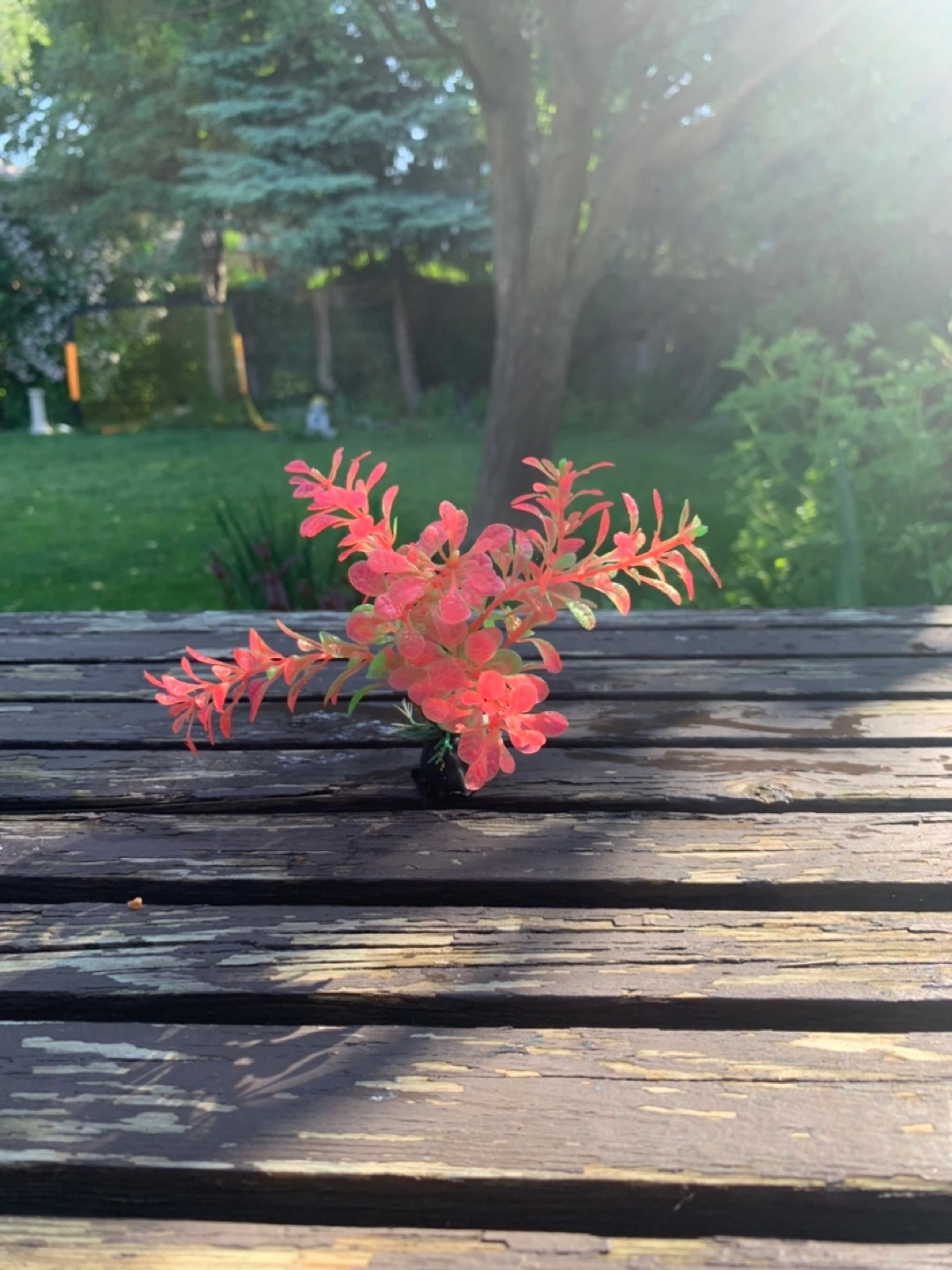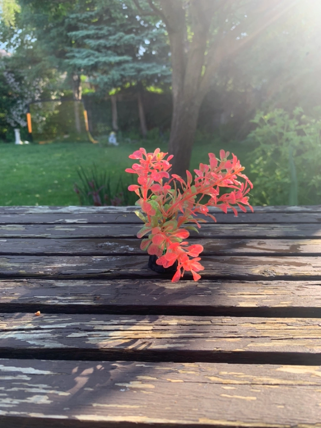 A vibrant coral-coloured aquarium plant. The plant has many leafy branches and a black base. Decorate any tank to your liking.