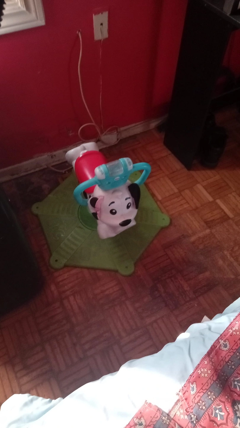 A colourful ride-on toy. It has a green base. It is in the shape of a dog's head. A great way to provide your little one with some fun.