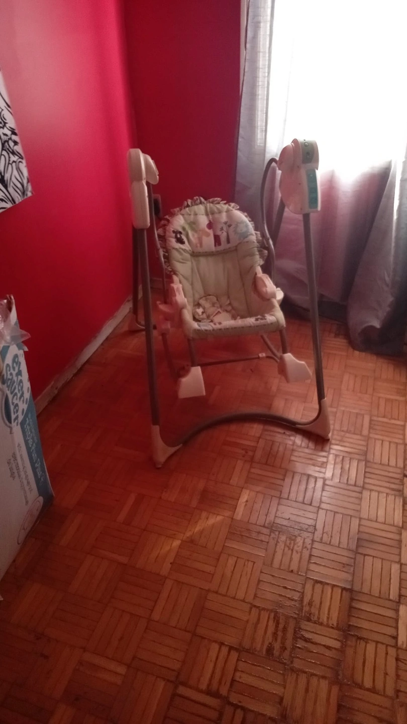 A baby swing for a calming experience. Features a neutral pattern, likely for a baby, and a sturdy frame.