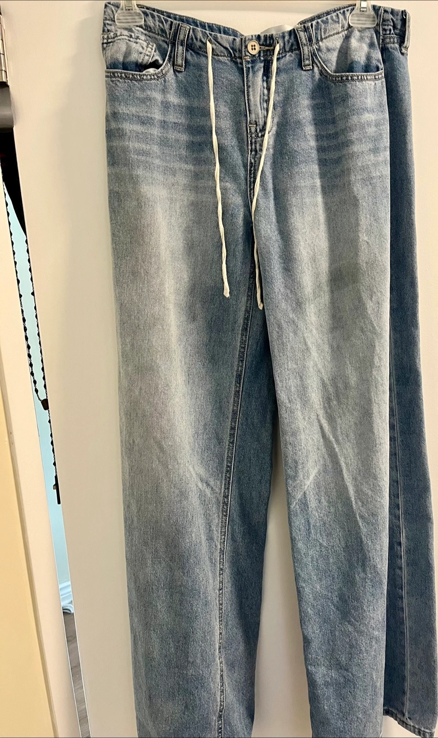 Loose fitting jeans. You can use the draw string for a good fit. Light wash. Two back pockets. Drawstring around the waist. These stylish jeans will keep you comfy all day long. They will look awesome with a crop top and comfortable shoes. Pickup and cash only.