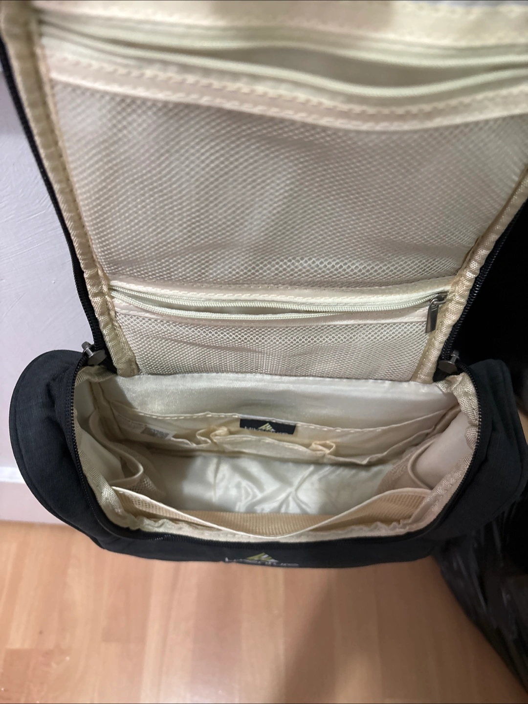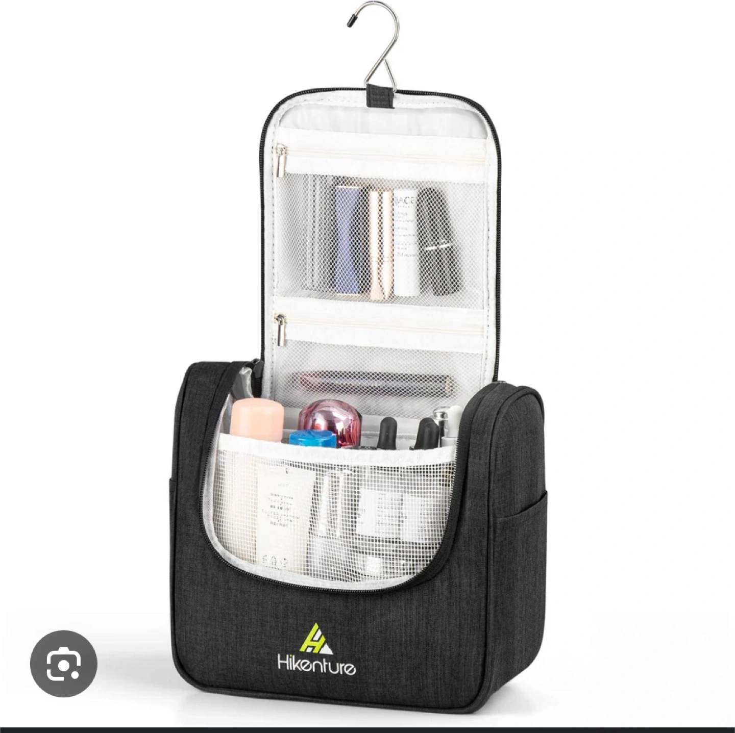 Never used. A stylish, practical travel cosmetic bag. Features several compartments for organization, including zippered and mesh pockets. Includes a hanging hook for easy access. Organizing your toiletries will become stress-free with this bag.