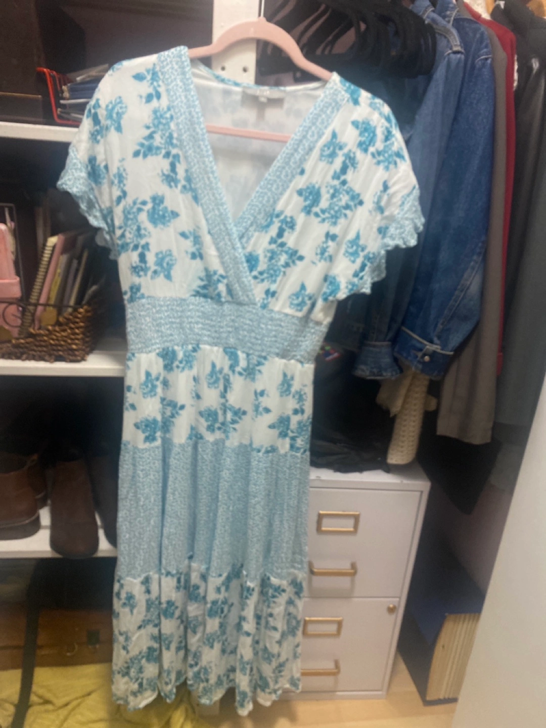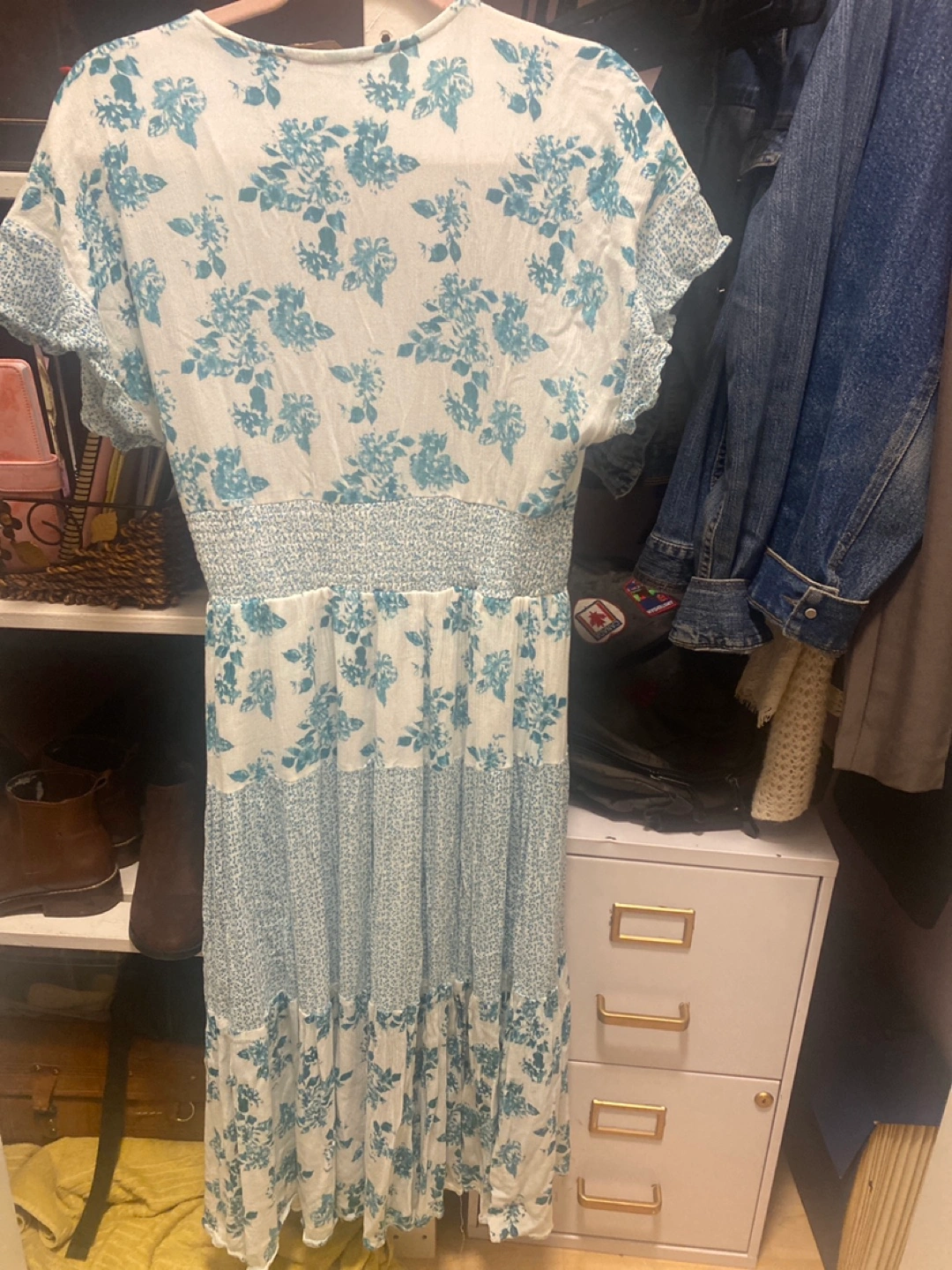 Beautiful dress in white with blue floral print. Features a v-neck, short sleeves, and a flowing skirt. Perfect for any occasion, especially a sunny day out.