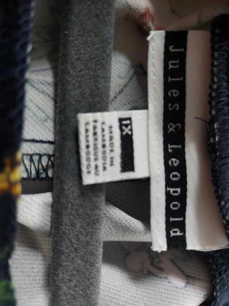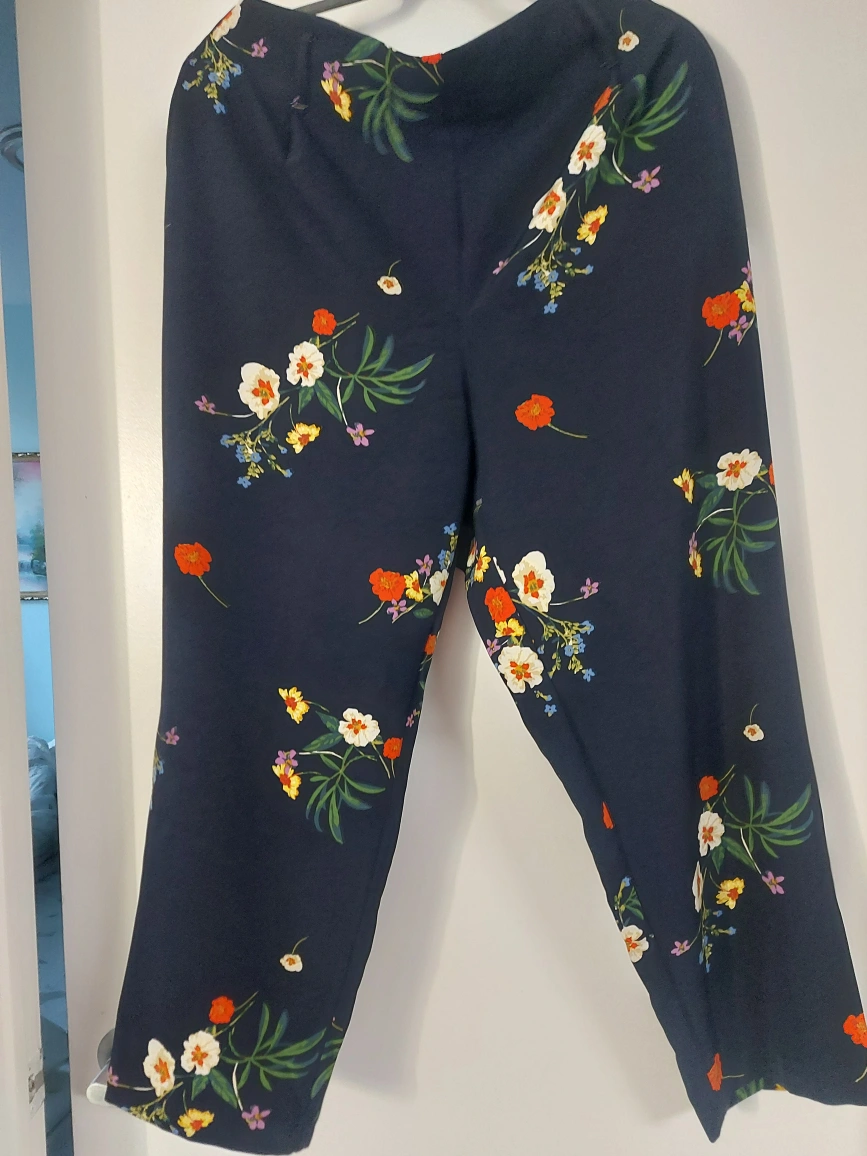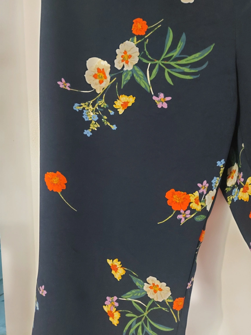 A pair of navy blue pants with a colorful floral print. Wide leg design. Made in Cambodia. You will be excited to add these to your collection.