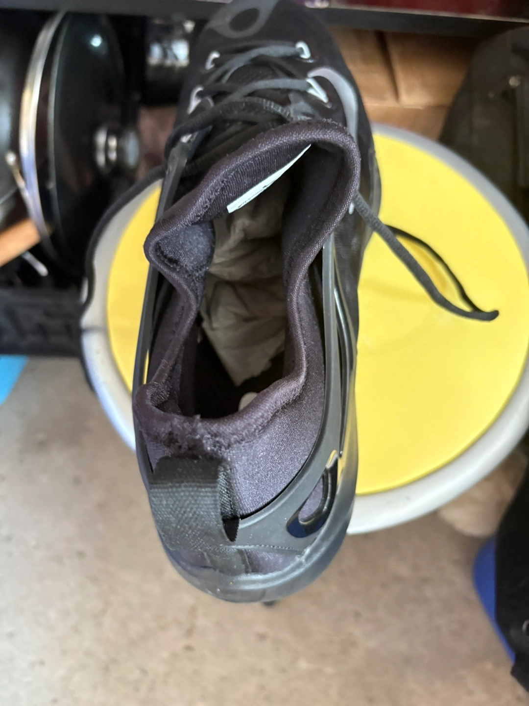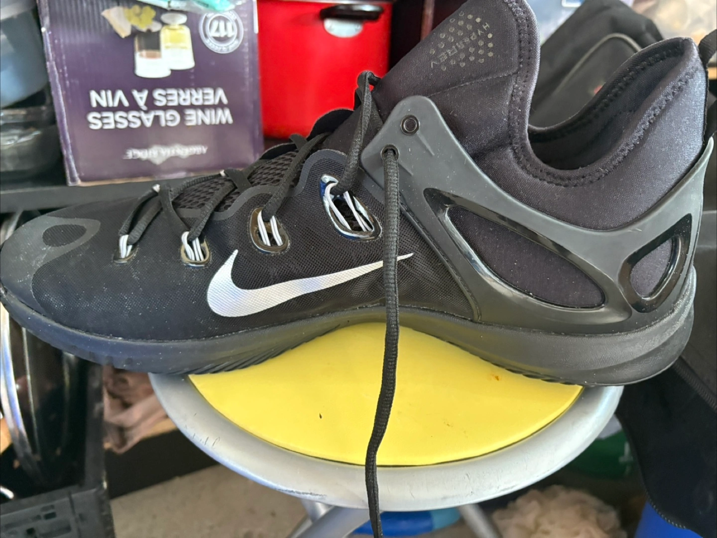Black athletic shoes with laces. The shoe has a mesh exterior. It has a Nike swoosh on the side. Consider these shoes for a refreshing walk.