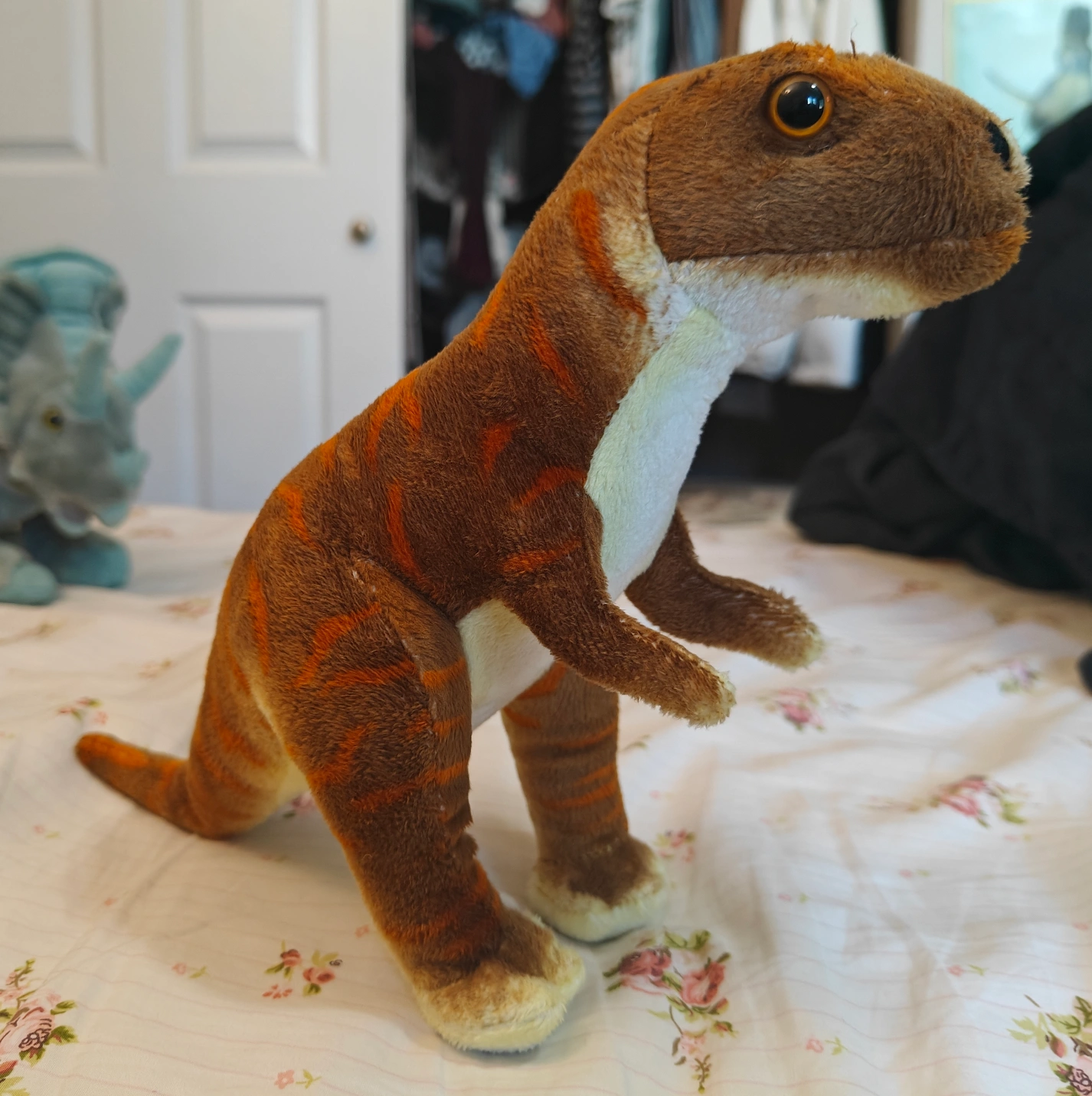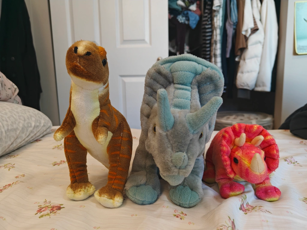 Offering a collection of dinosaur plush toys. Included are a brown T-Rex, a blue Triceratops, and a red Triceratops. These would look great on a bed. Perfect gift for a newborn or preschooler. Can sell them individually or lower the price as a bundle.