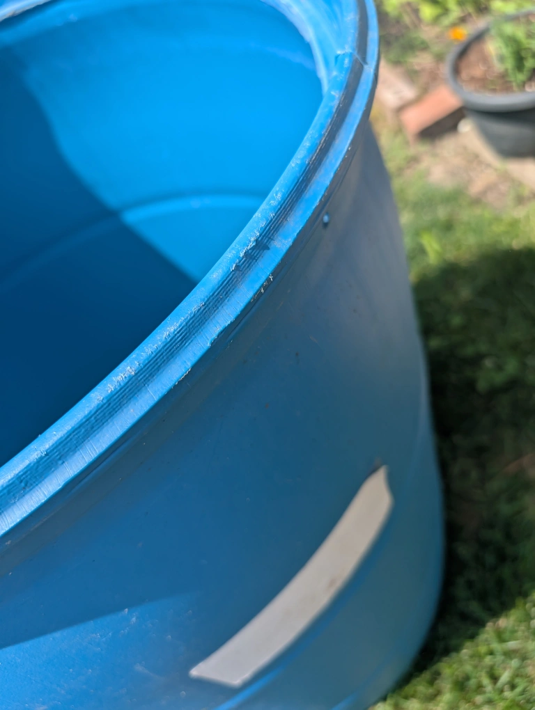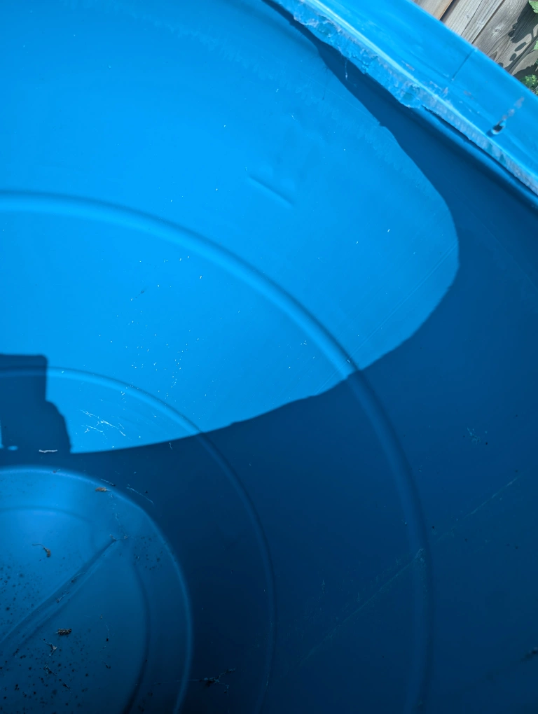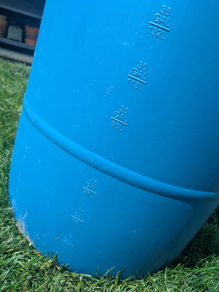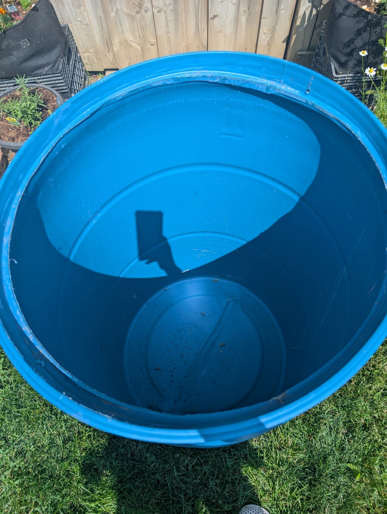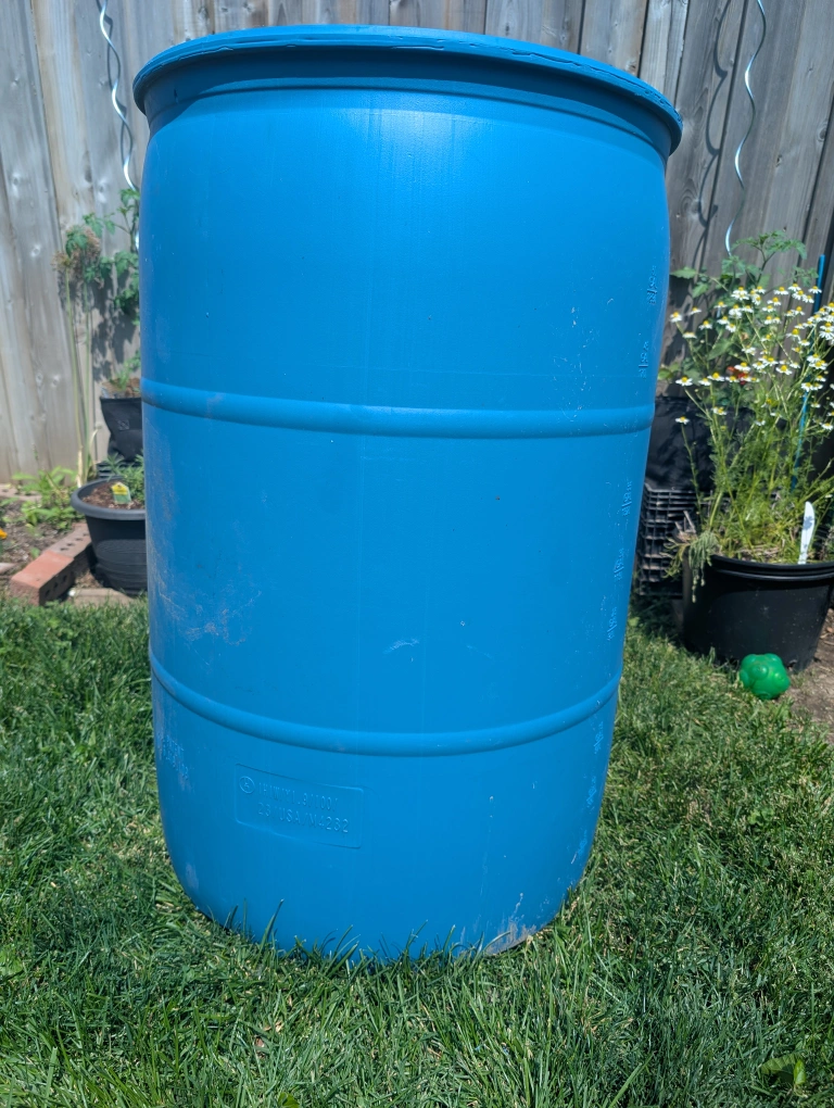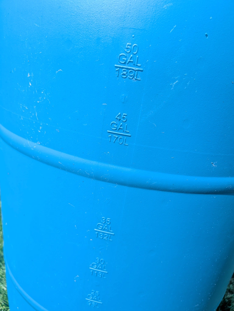 Durable blue barrel. Graduated measurements along the side. Useful for a variety of outdoor and storage needs, or use as a rain barrel Must sell soon Sorry, no etransfers
