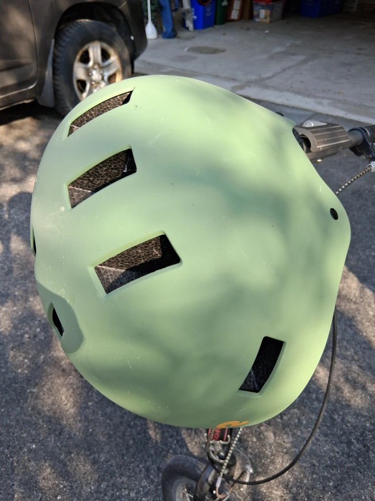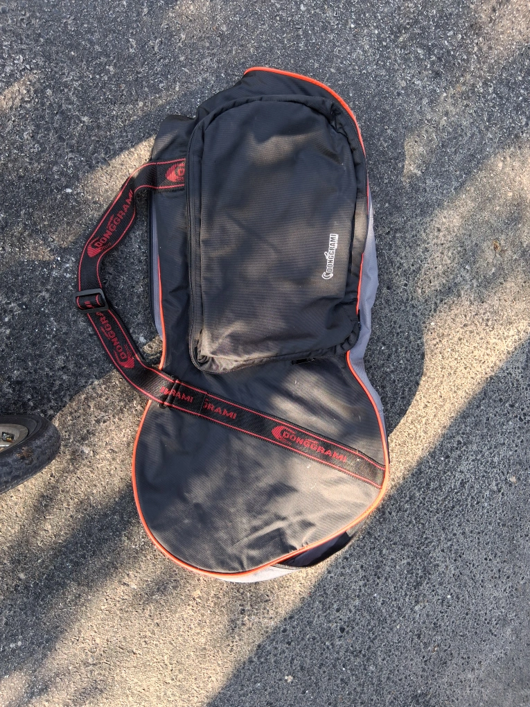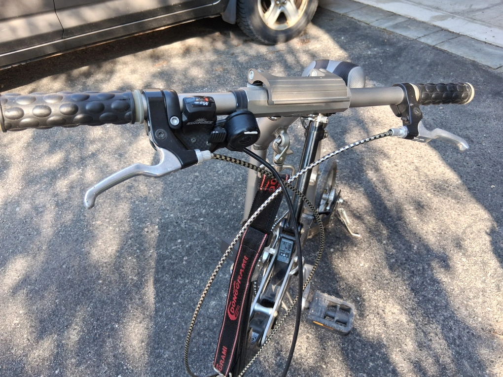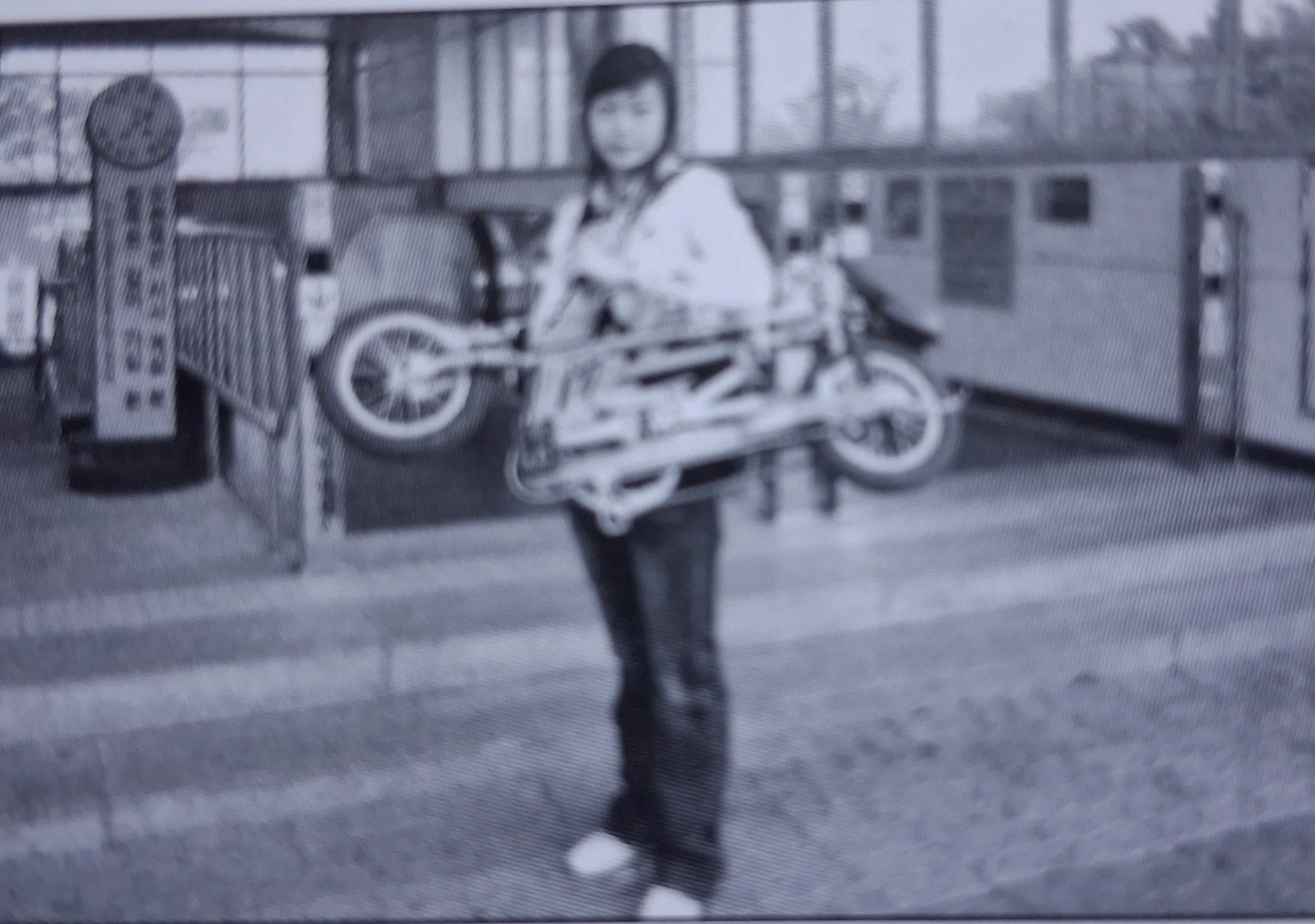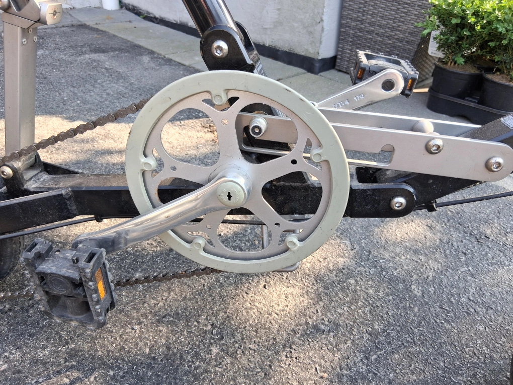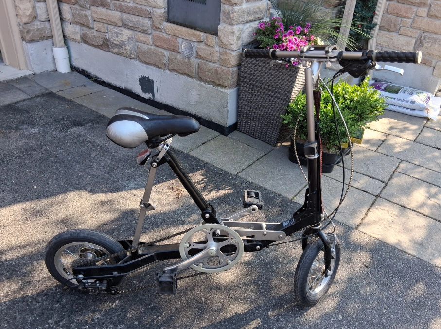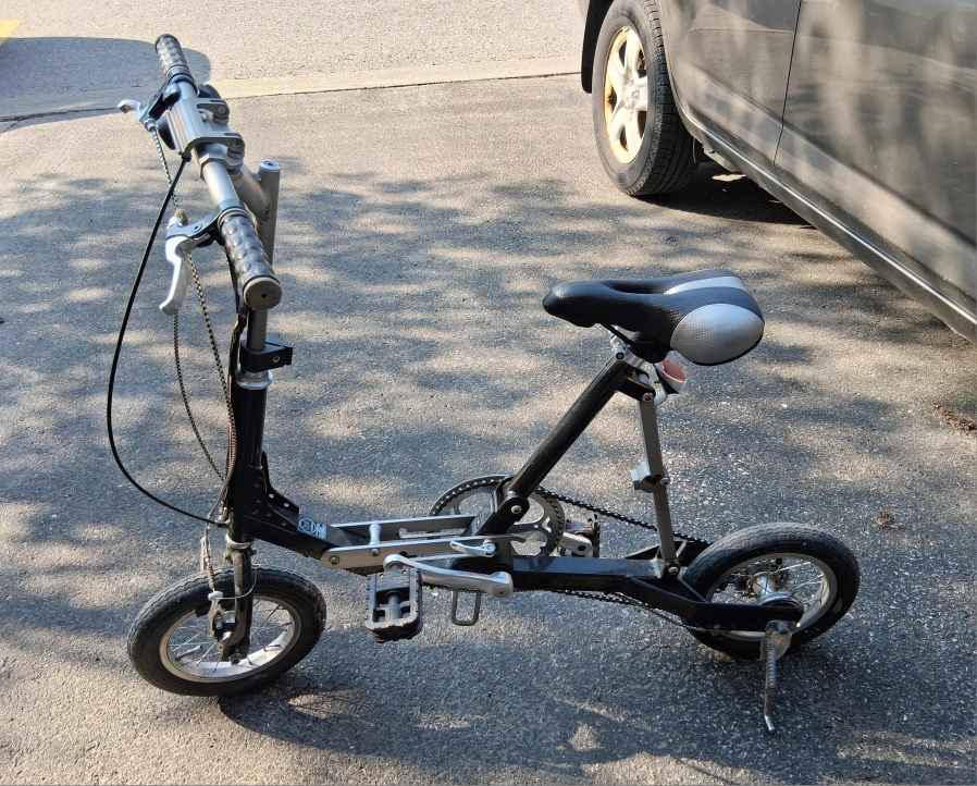 A folding bike which can be folded in the longitudinal direction. The product manual and instructions are attached and a bag is included to store the bike. A helmet is included. I bought it around $1000 about 10years ago and haven't used couple of years so it probably needs routine maintenance. The bike features black and silver accents. A black seat is present. A chain is connected to the pedals. Consider going for a relaxing ride on this mini bike.