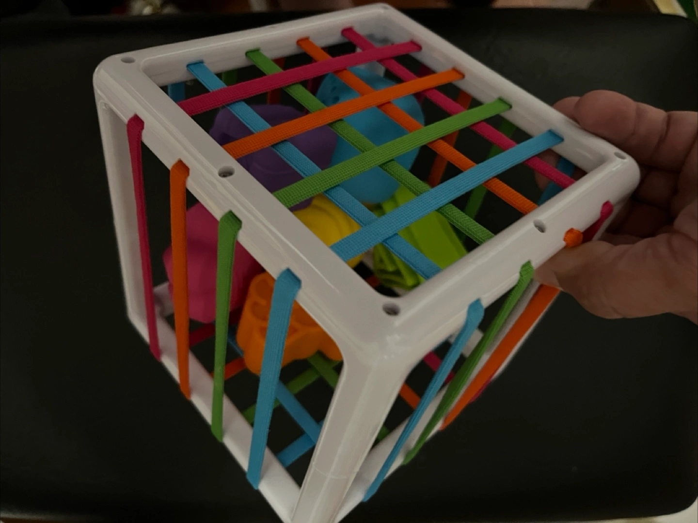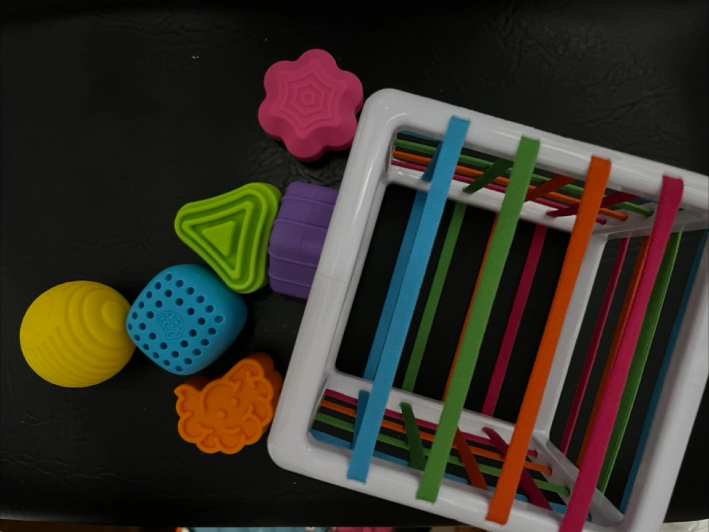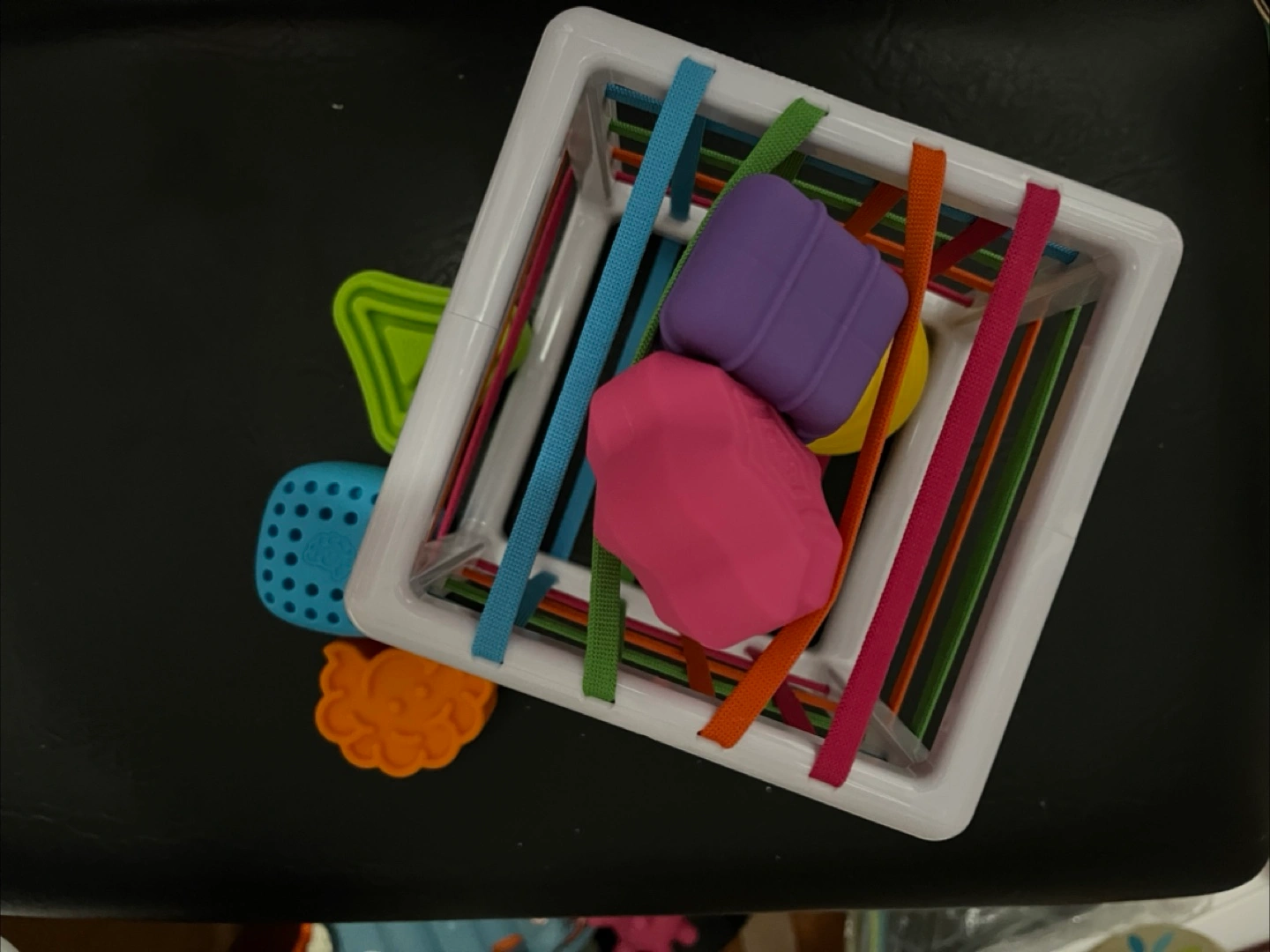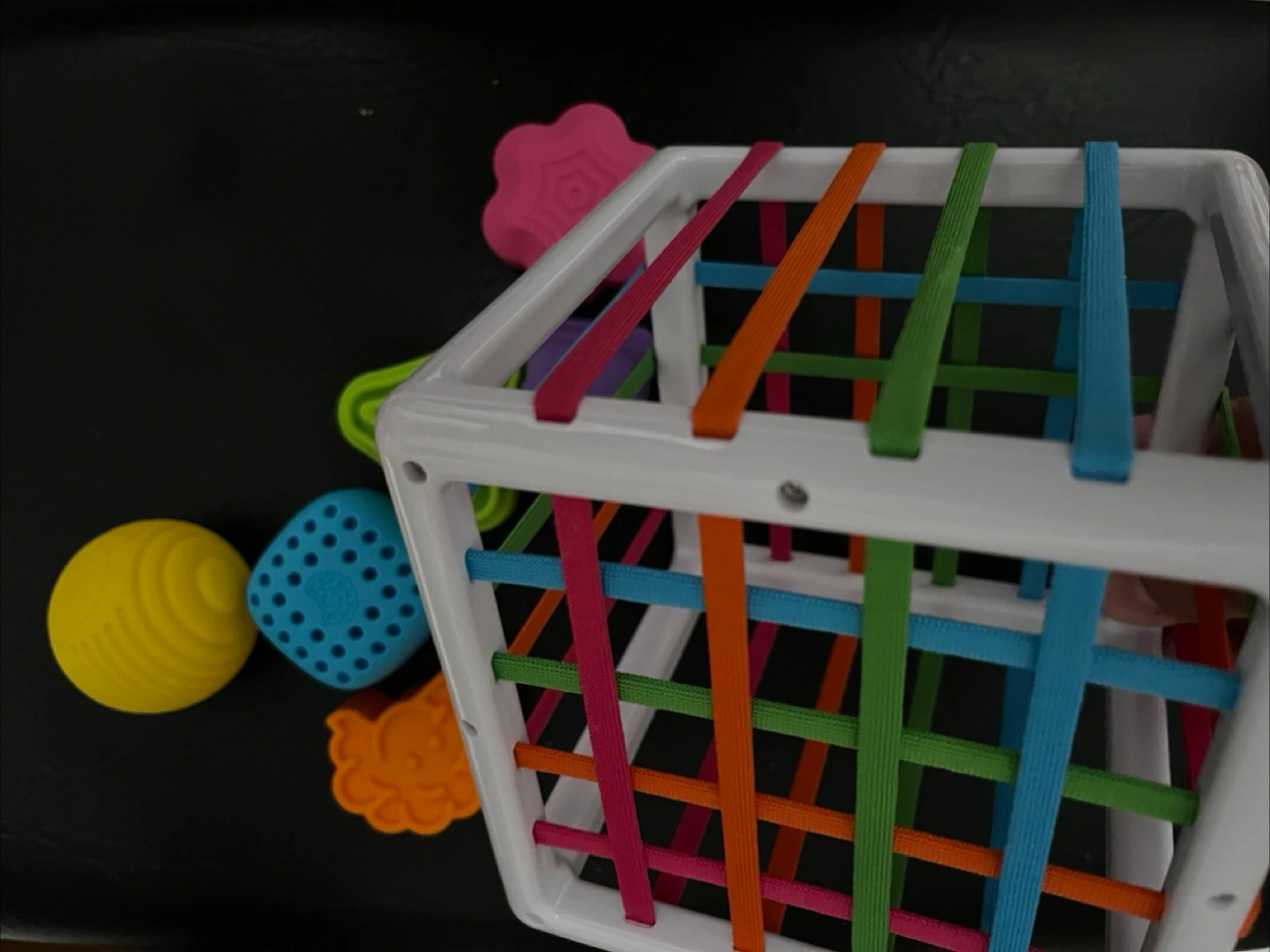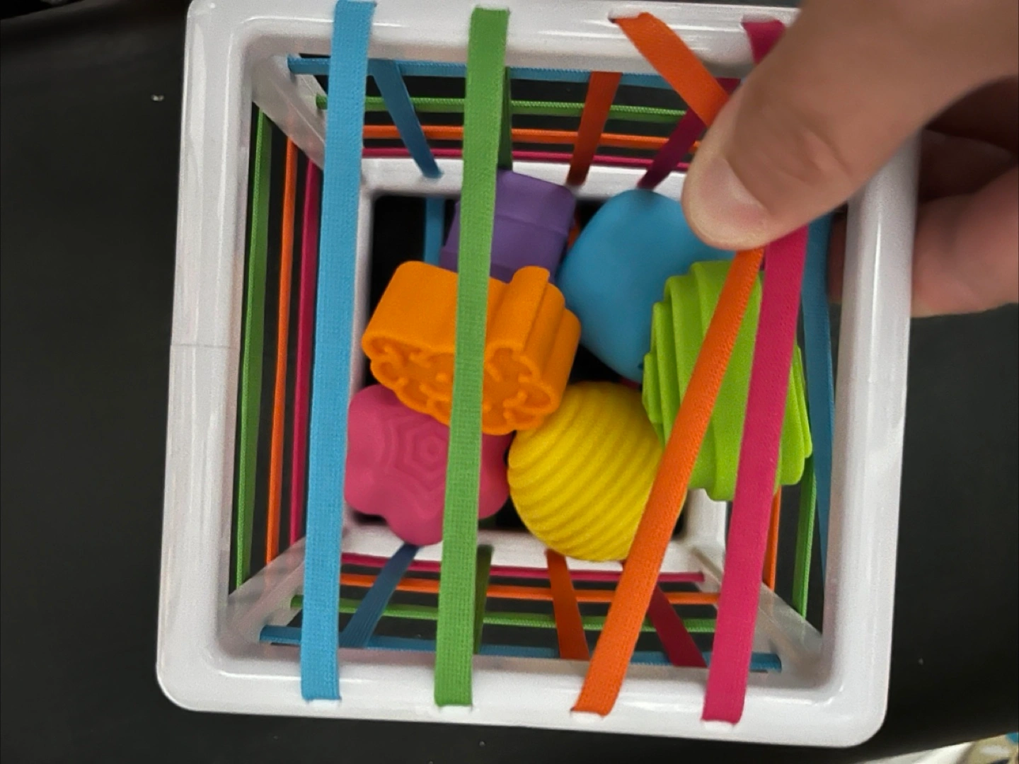 Here is a colorful shape sorter cube, perfect for a child to learn about shapes and colours. The shapes can be placed into the cube, and the ribbons can be pulled to release them. The shapes are different shapes and colours.
