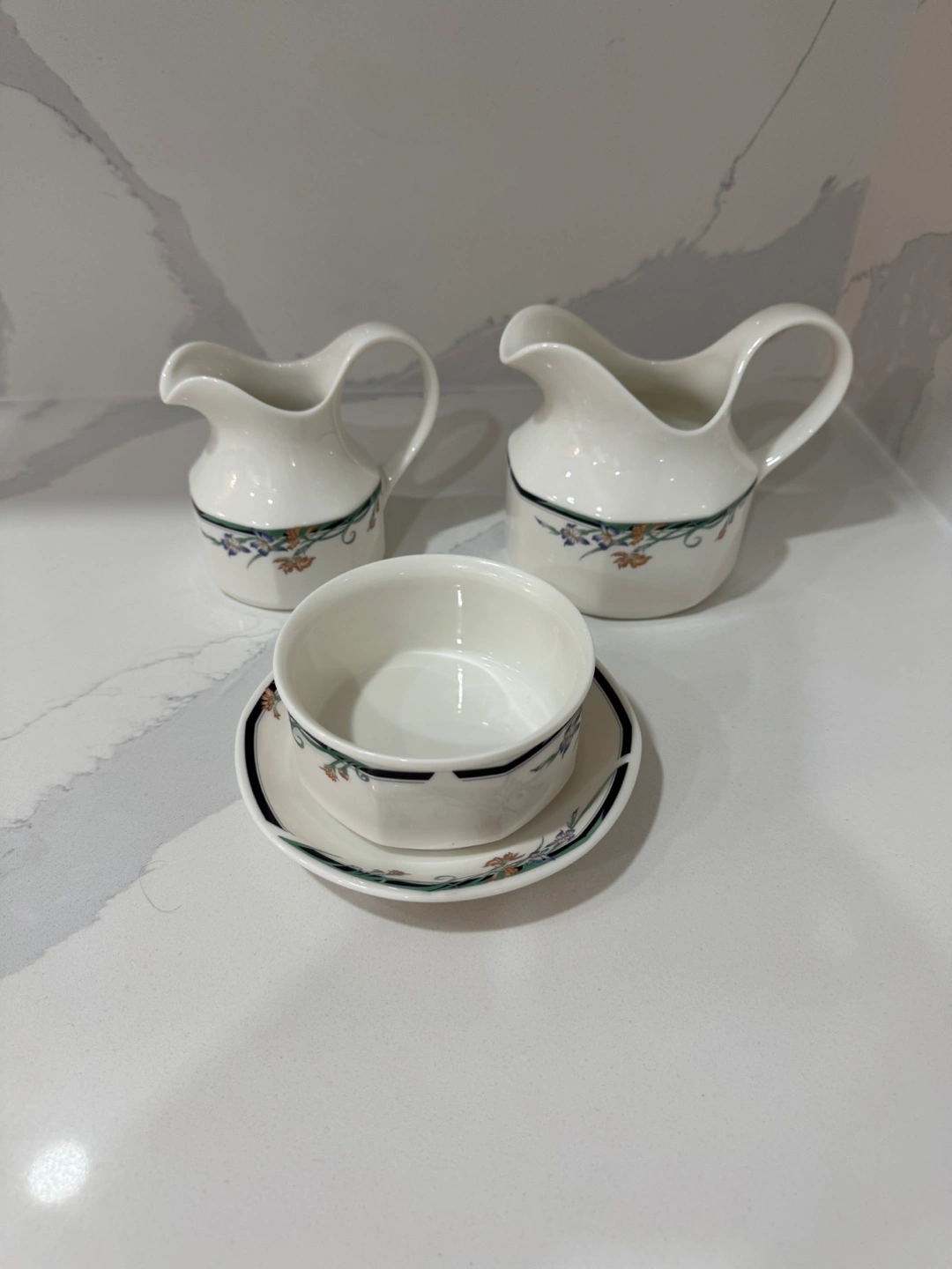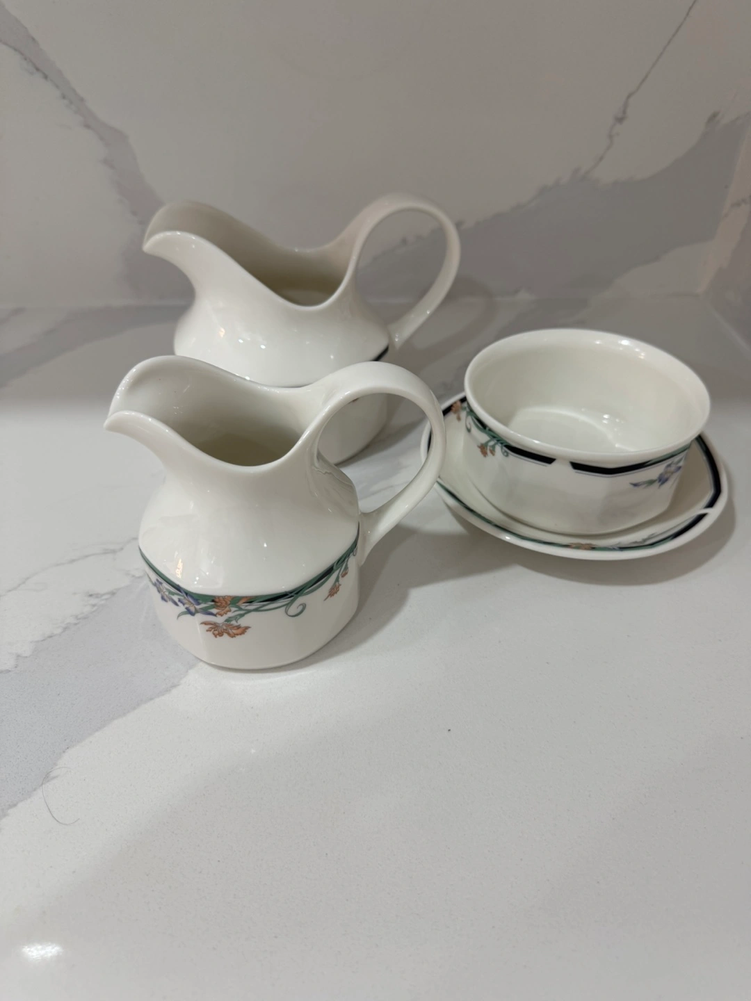 Royal Doulton Juno Creamer Jug and Sugar Bowl. Made In England. Bone China. Features two cream pitchers. Beautiful white with floral accents. Serve your guests with elegance. Pick up at Steeles and Bathurst
