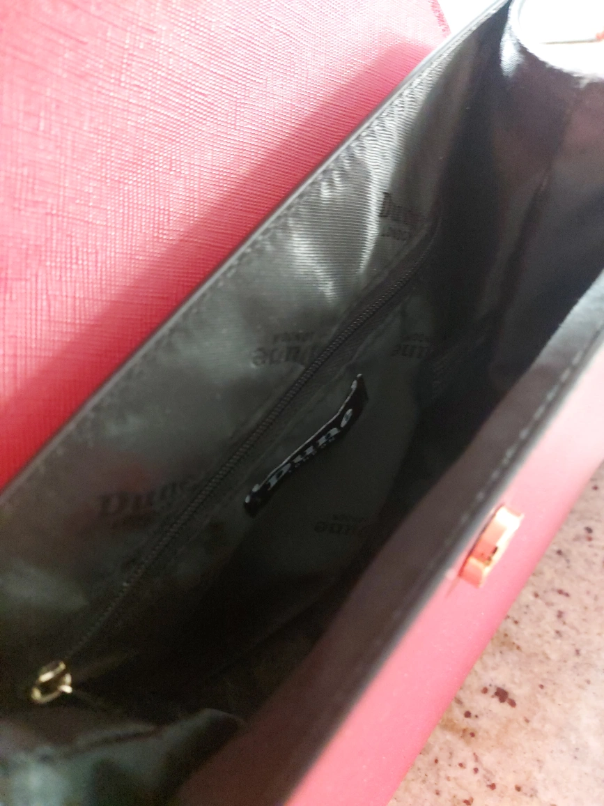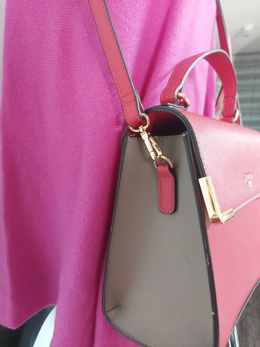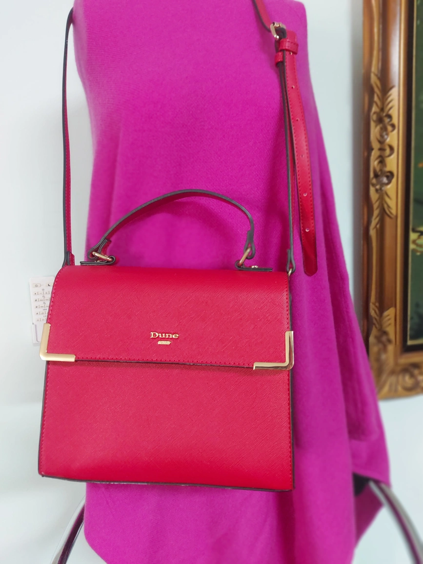 A red handbag. The bag has a top handle. The interior looks spacious. A great bag to keep by your side.