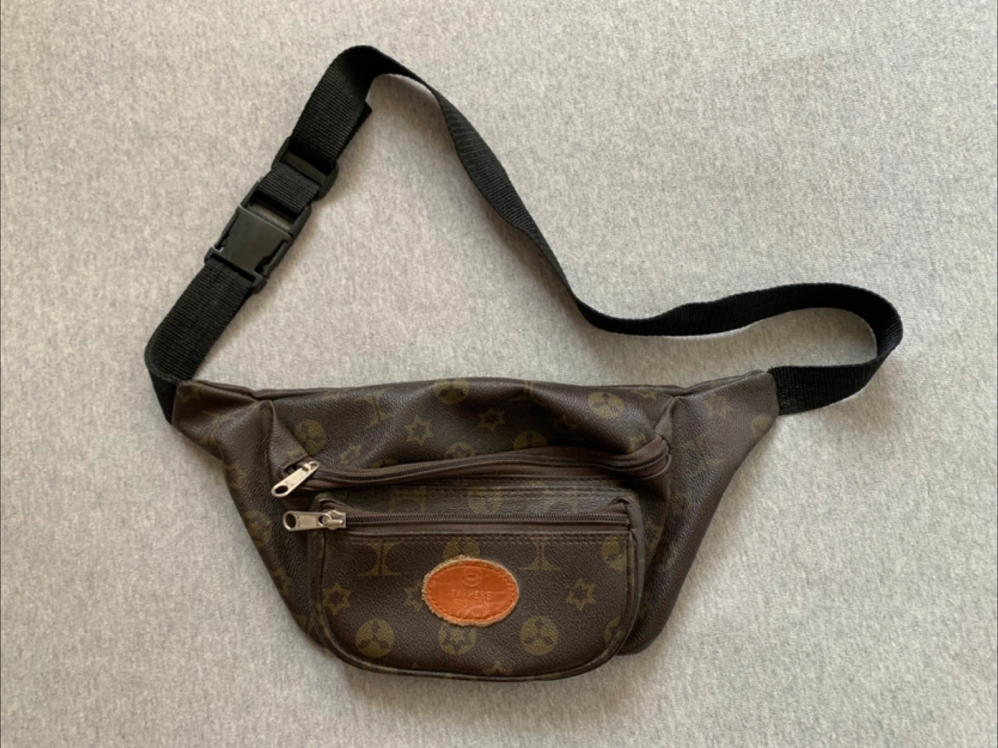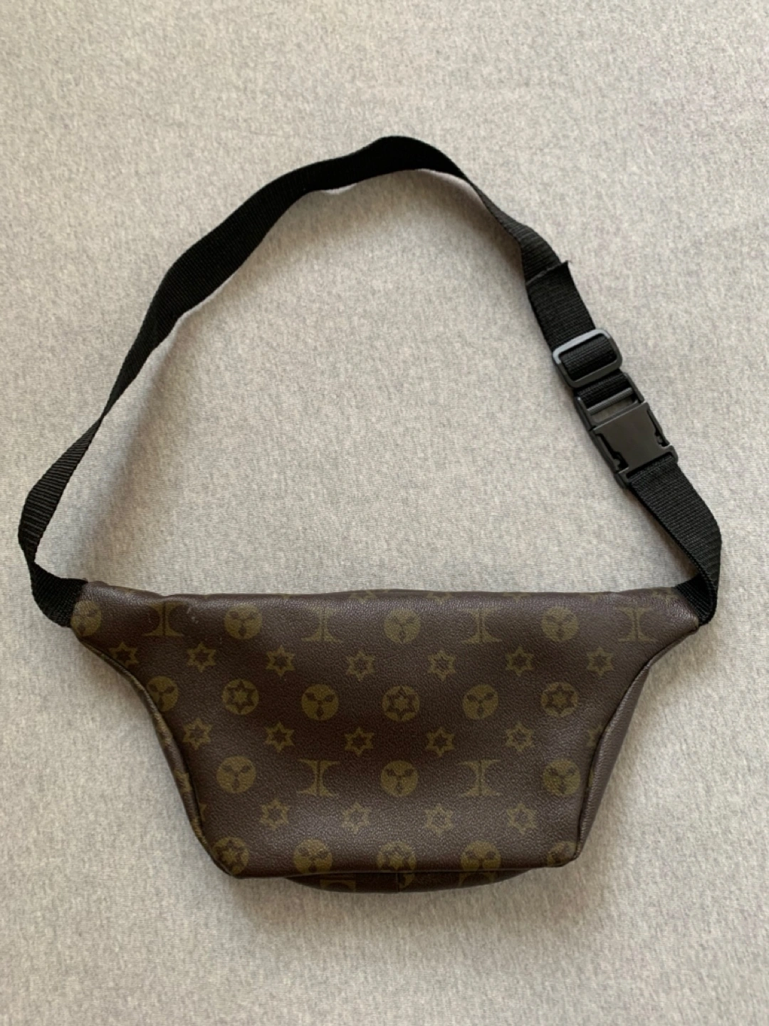 A brown fanny pack, adorned with a repeating pattern. Includes a black strap and a buckle closure. Vintage 90’s waist pouch