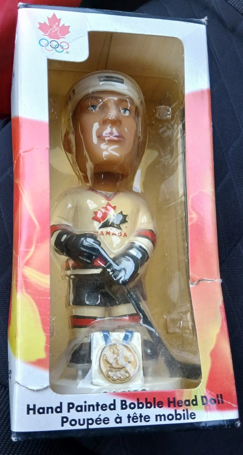 A bobblehead figure. The figure is inside of its original packaging.