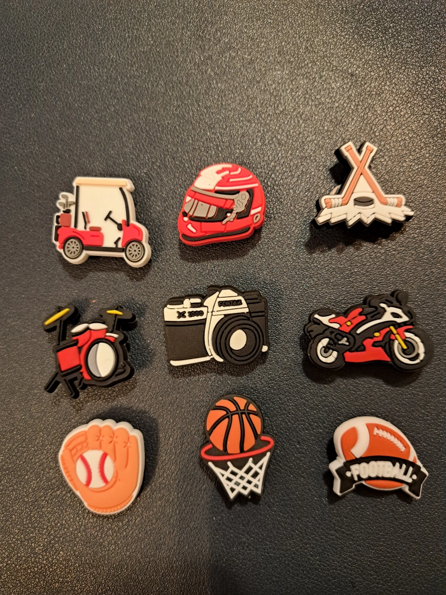 A collection of different themed shoe charms. Includes a golf cart, race car helmet, hockey sticks, drum set, camera, motorcycle, baseball glove, basketball hoop, and football. Add these fun accessories to your shoes to express yourself, it can be quite therapeutic.