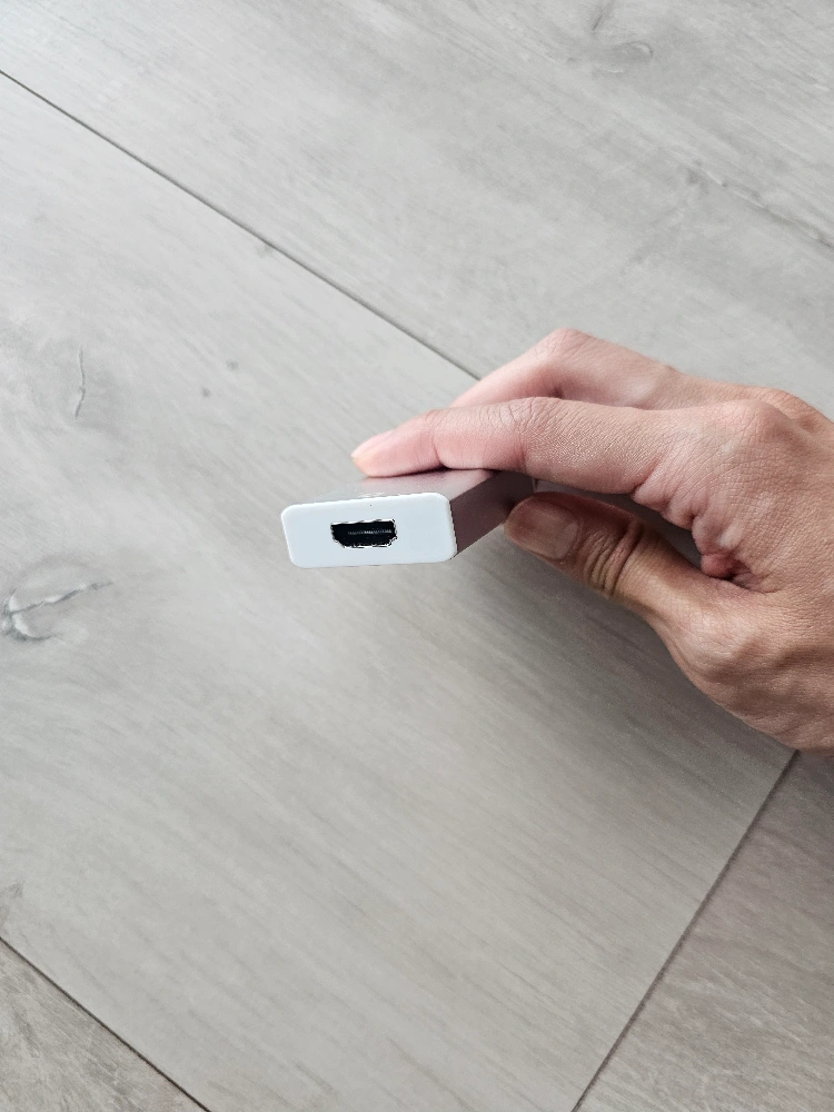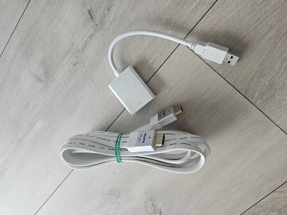 HDMI adapter and cable set. Features a white colour. One end of the cable shows a USB port. The cable is kept together with a rubber band. You could use this to comfortably set up your home entertainment system.