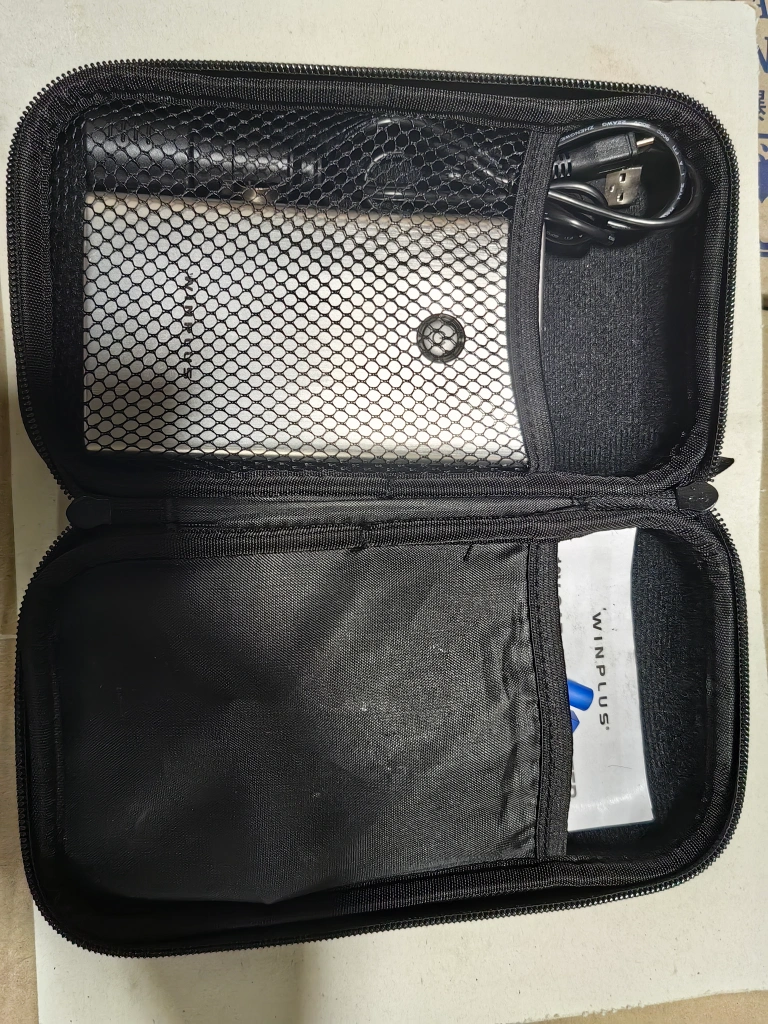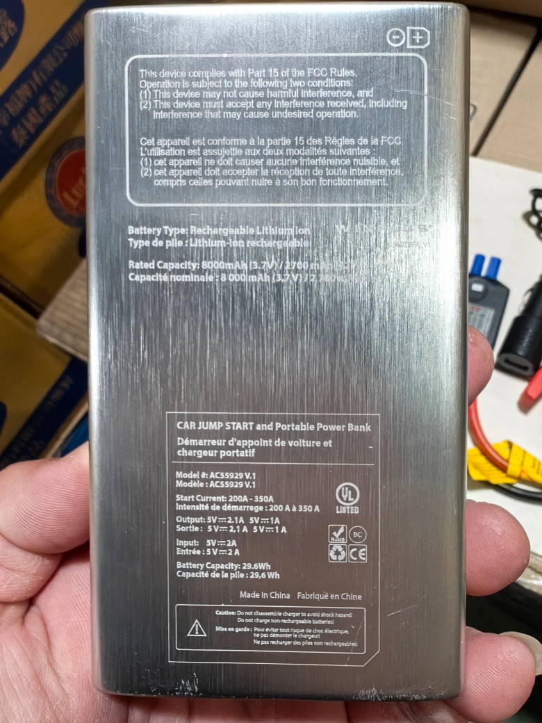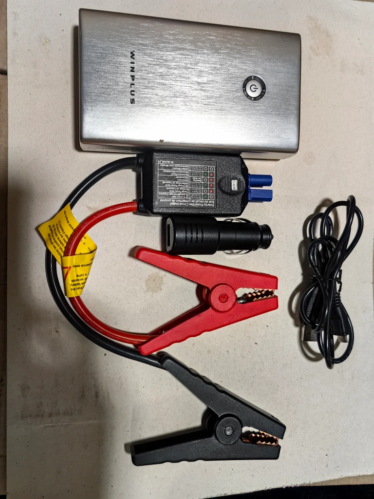 A compact car jump starter and portable power bank. It is safely stored in a black zippered case. Comes with various accessories like jumper cables and a USB cable. With this item, you can feel a sense of assurance knowing you are prepared for unexpected situations.