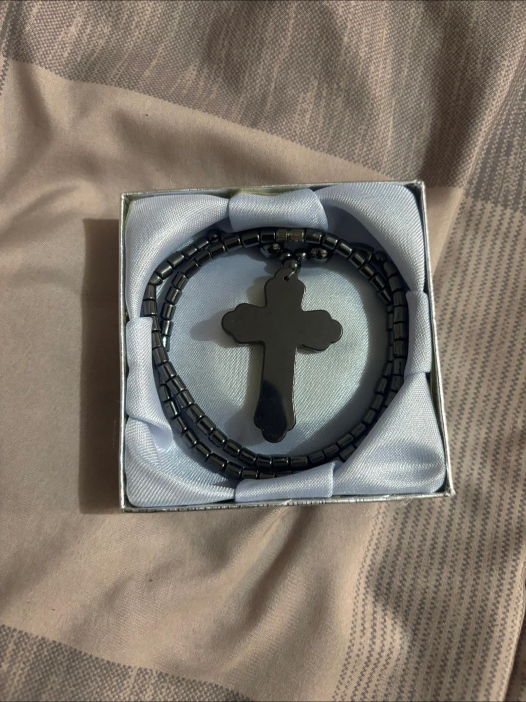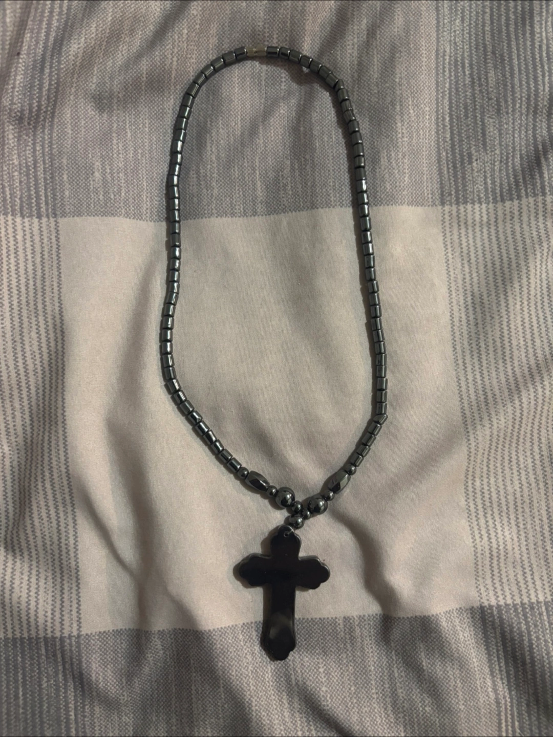 Dark cross pendant. Necklace consists of small, black, rounded beads. Arrives in a square gift box lined with light blue satin. Wearing this necklace may bring you peace of mind.