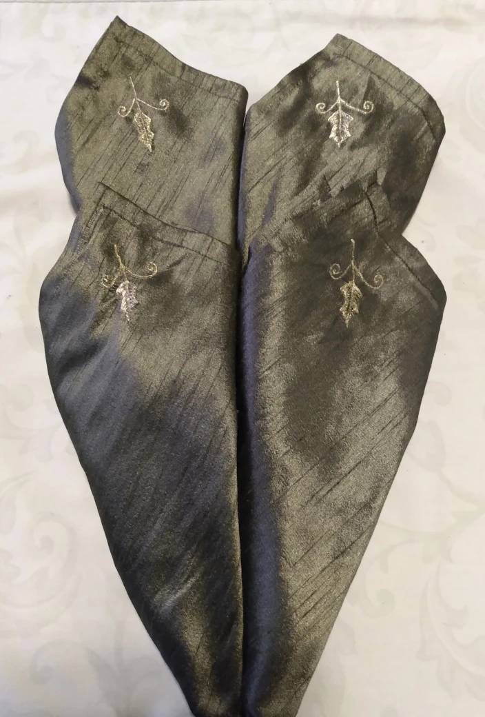These beautiful napkins offer an elegant touch to any table. The napkins appear to be a shimmery, dark color. Each napkin has embroidery. Consider these for a lovely holiday dinner.