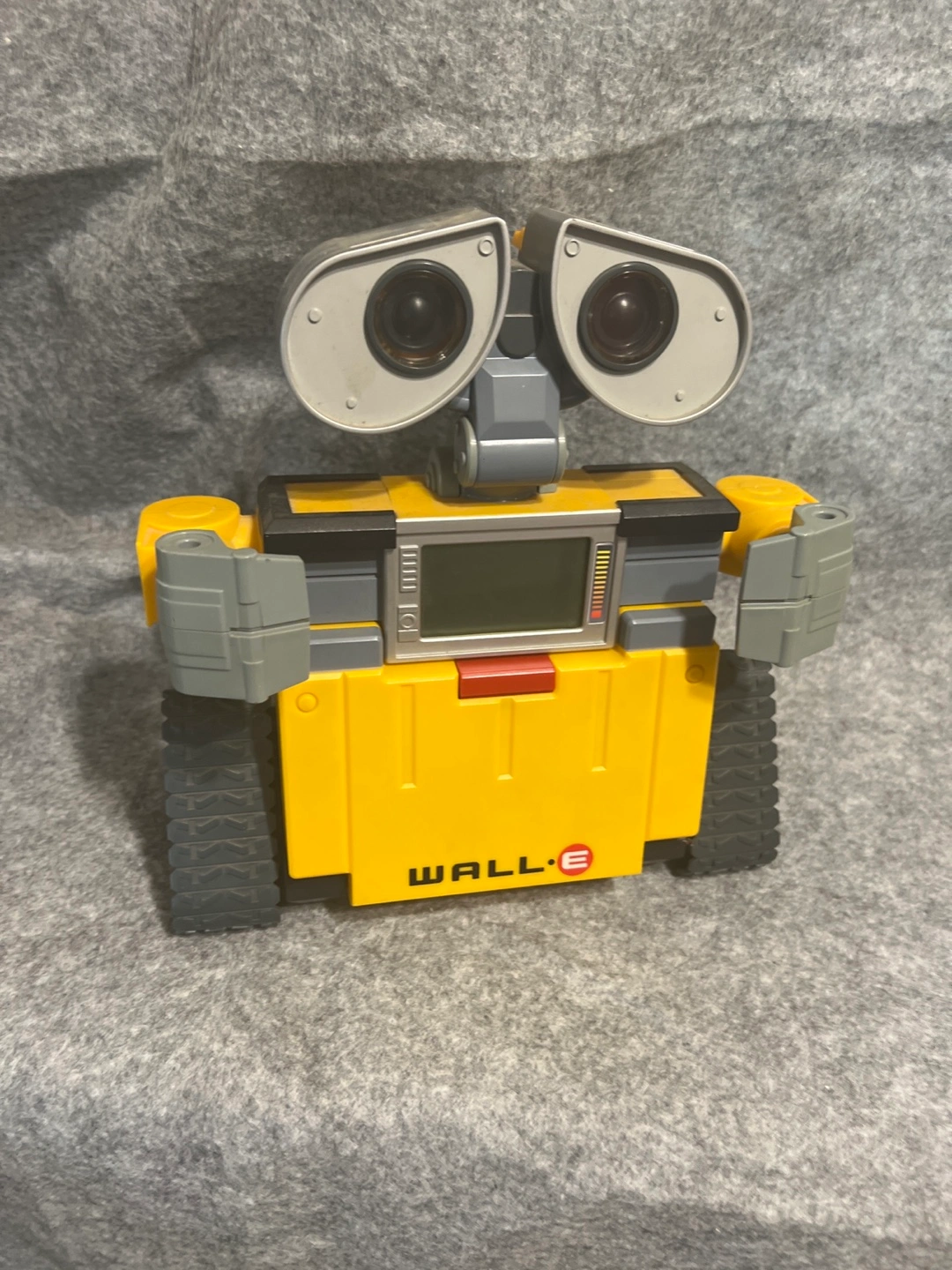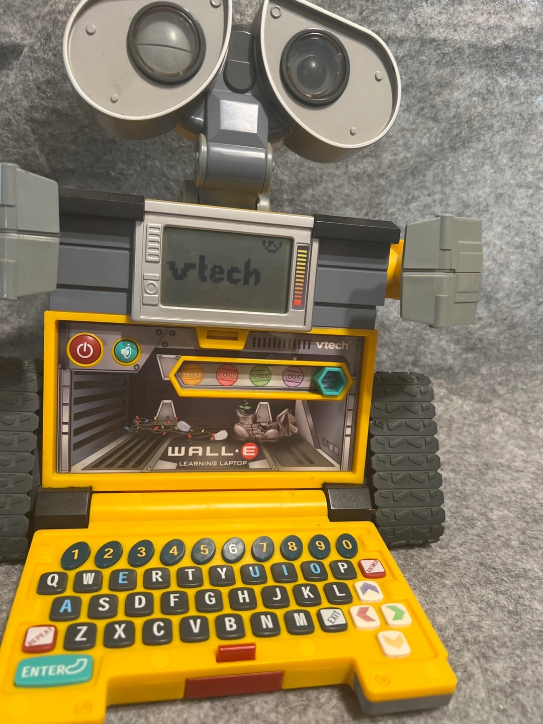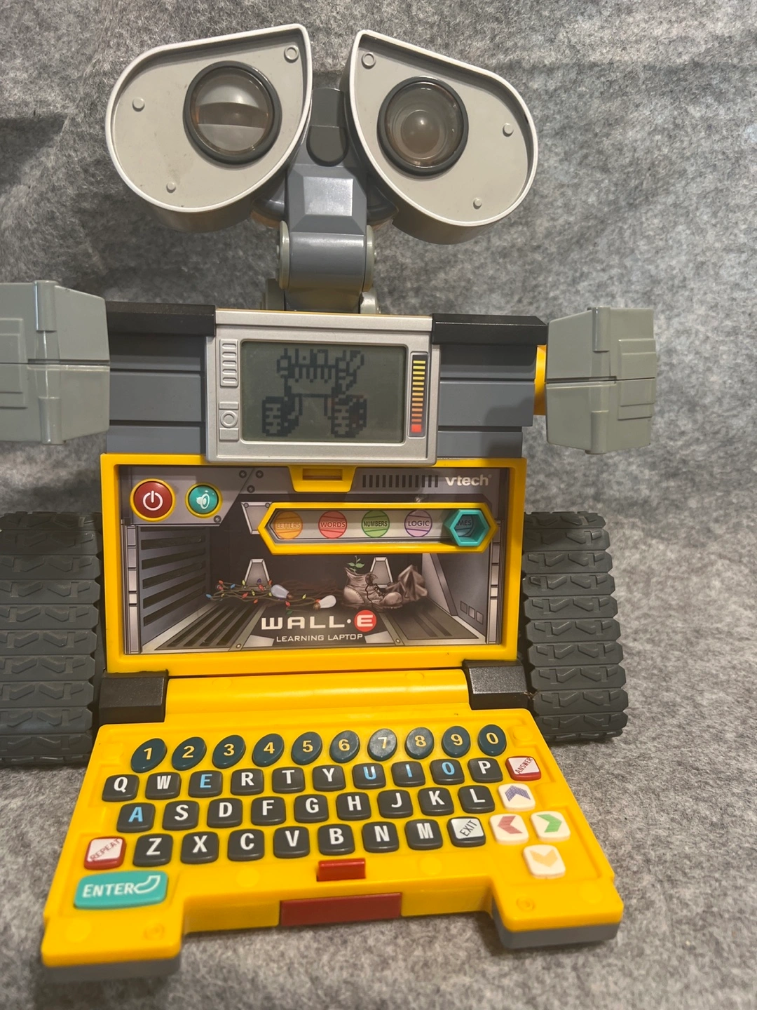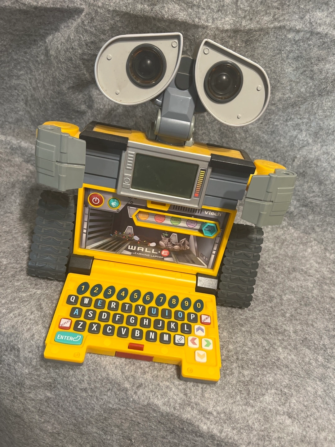 A yellow and grey WALL-E robot. Includes a keyboard, screen, and eyes. This could be a fun item to help children learn and play at the same time.