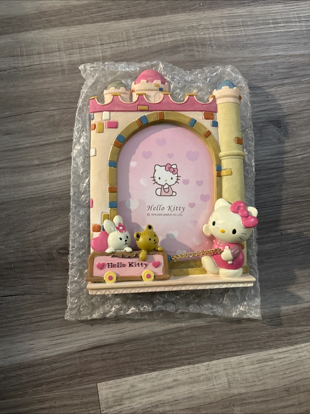 A detailed photo frame. Shaped like a castle, with figures of Hello Kitty and friends. You could fill this frame with a photo of a loved one to admire every day.