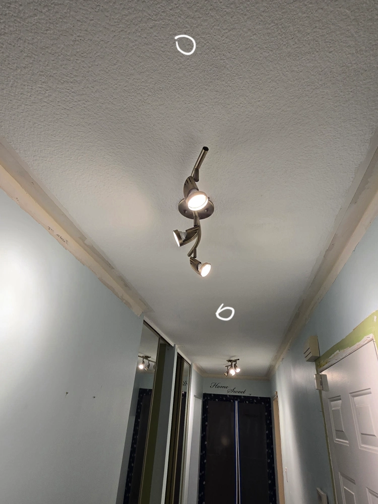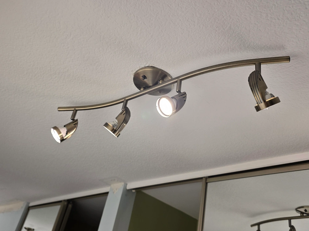 Track lighting fixture. Features multiple adjustable spotlights. Perfect for illuminating any space. Adding this fixture to your home can create a calm, well-lit atmosphere. 5 light- silver stainless steel - $45 4 - lights - golden stainless steel - $35 3 - lights - golden stainless steel - $25