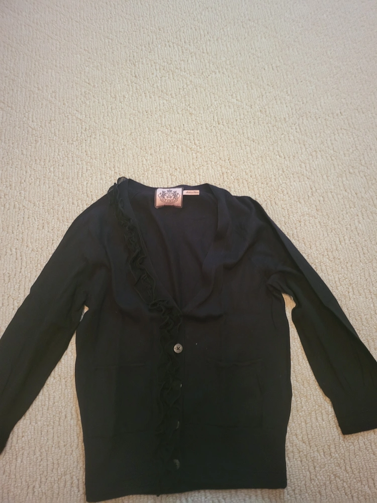 Beautiful black cardigan. Buttons down the front. Features pockets and ruffle detailing. A perfect piece to add to any wardrobe, you will feel at ease and comfortable in it.