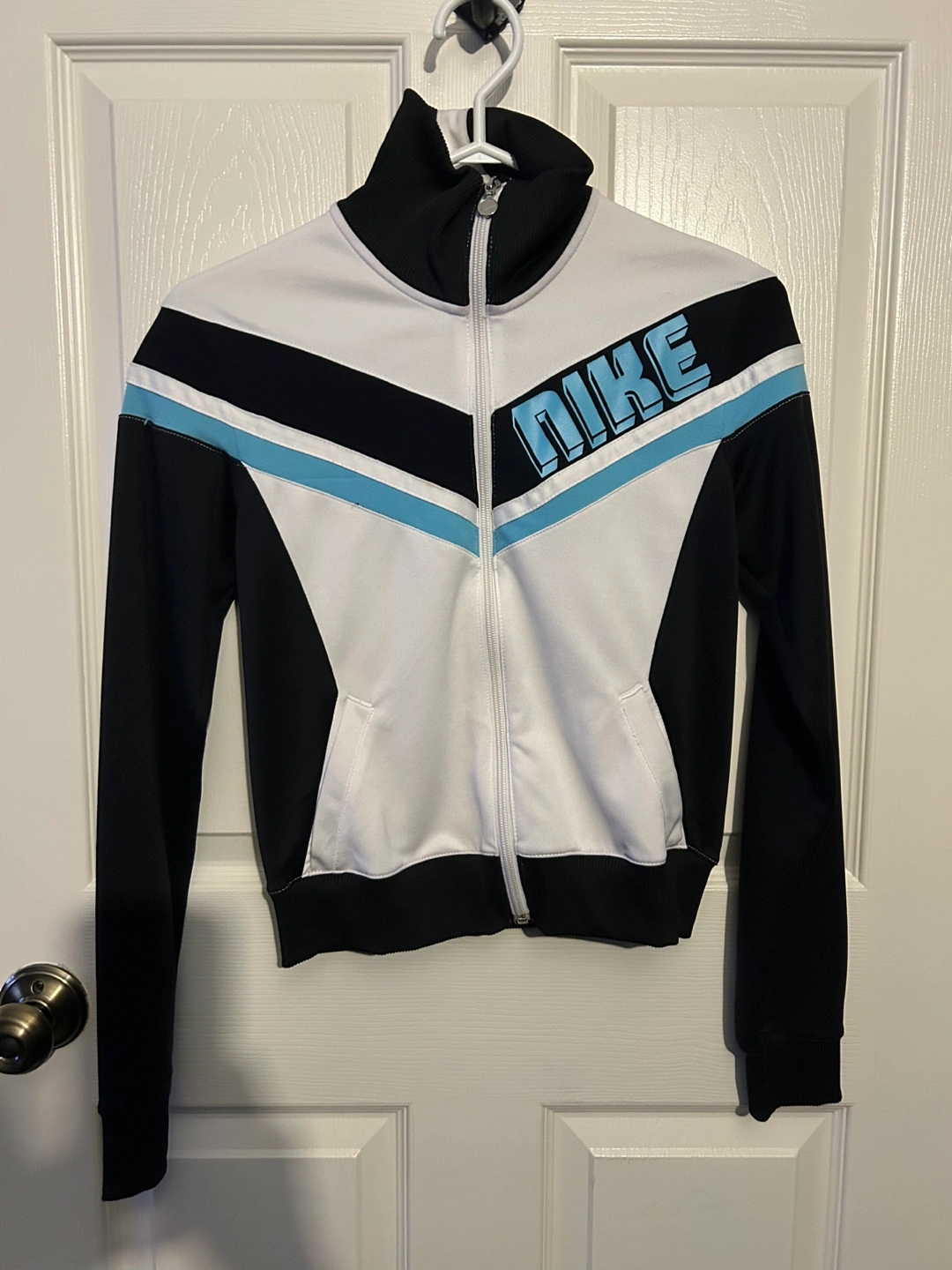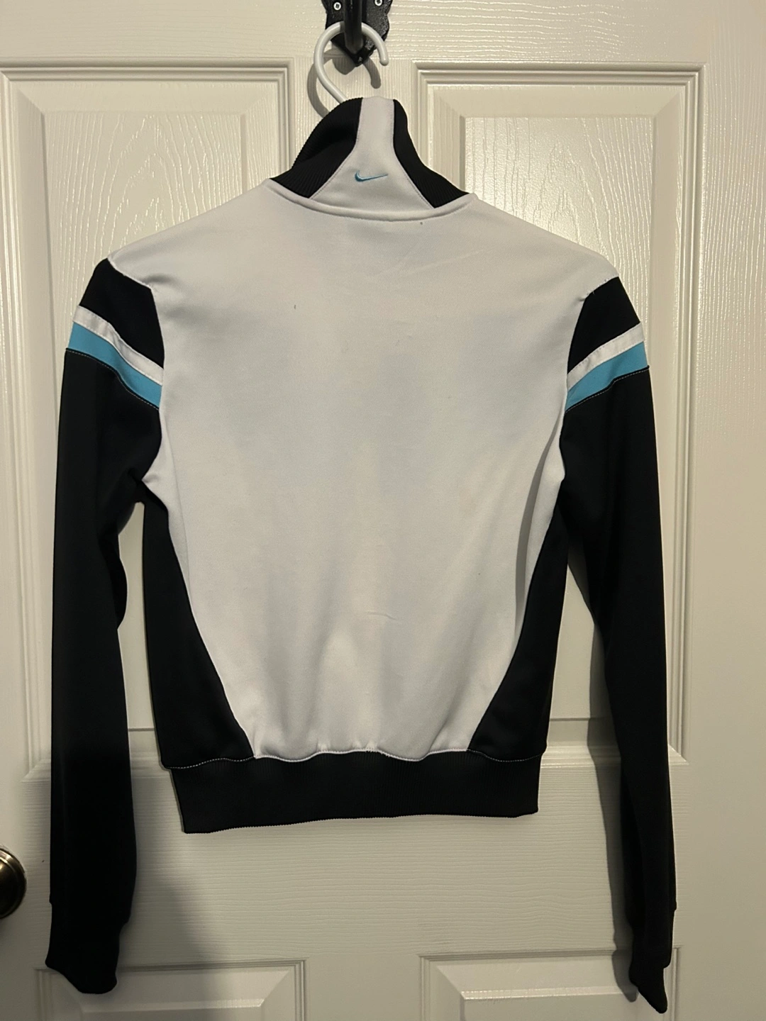 Black, white, and blue track jacket. Features a high collar. Has a zipper Size small. Good condition Tiny stain on the back that could be removed