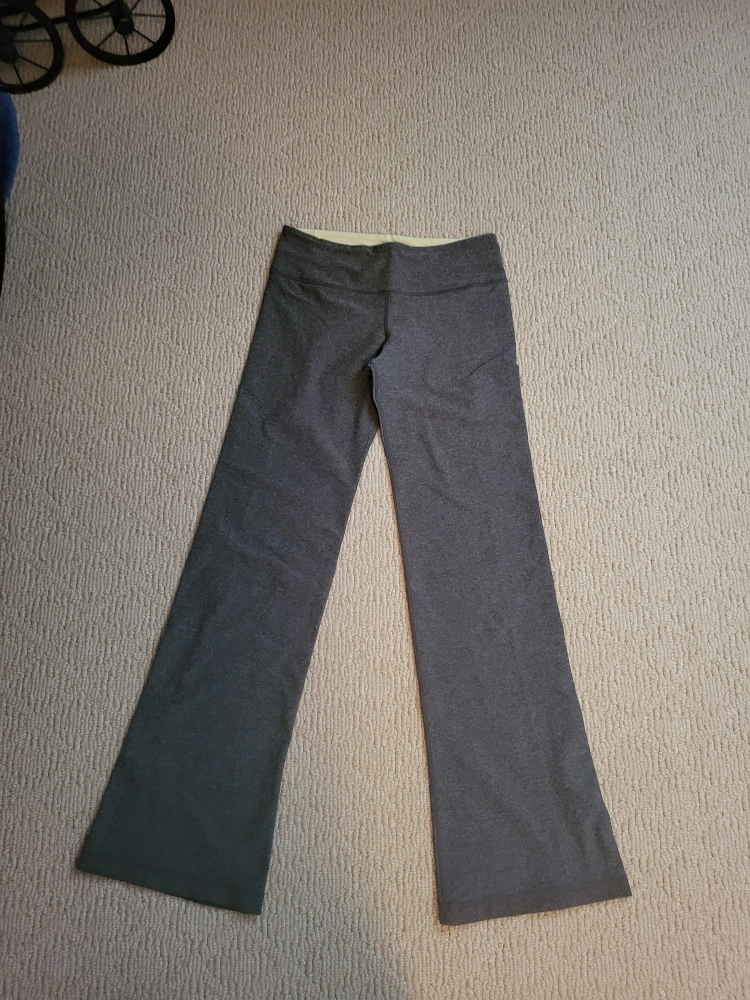 These yoga pants are gray with a wide-leg. Features a comfortable waistline. The perfect bottoms for your next yoga session.