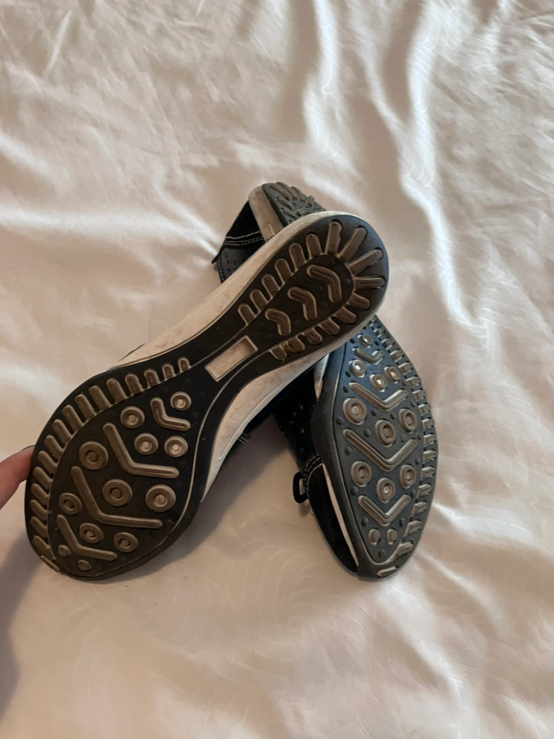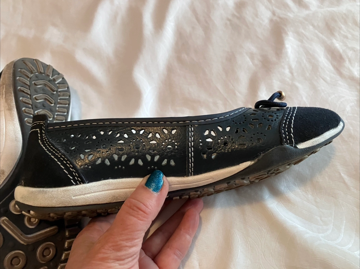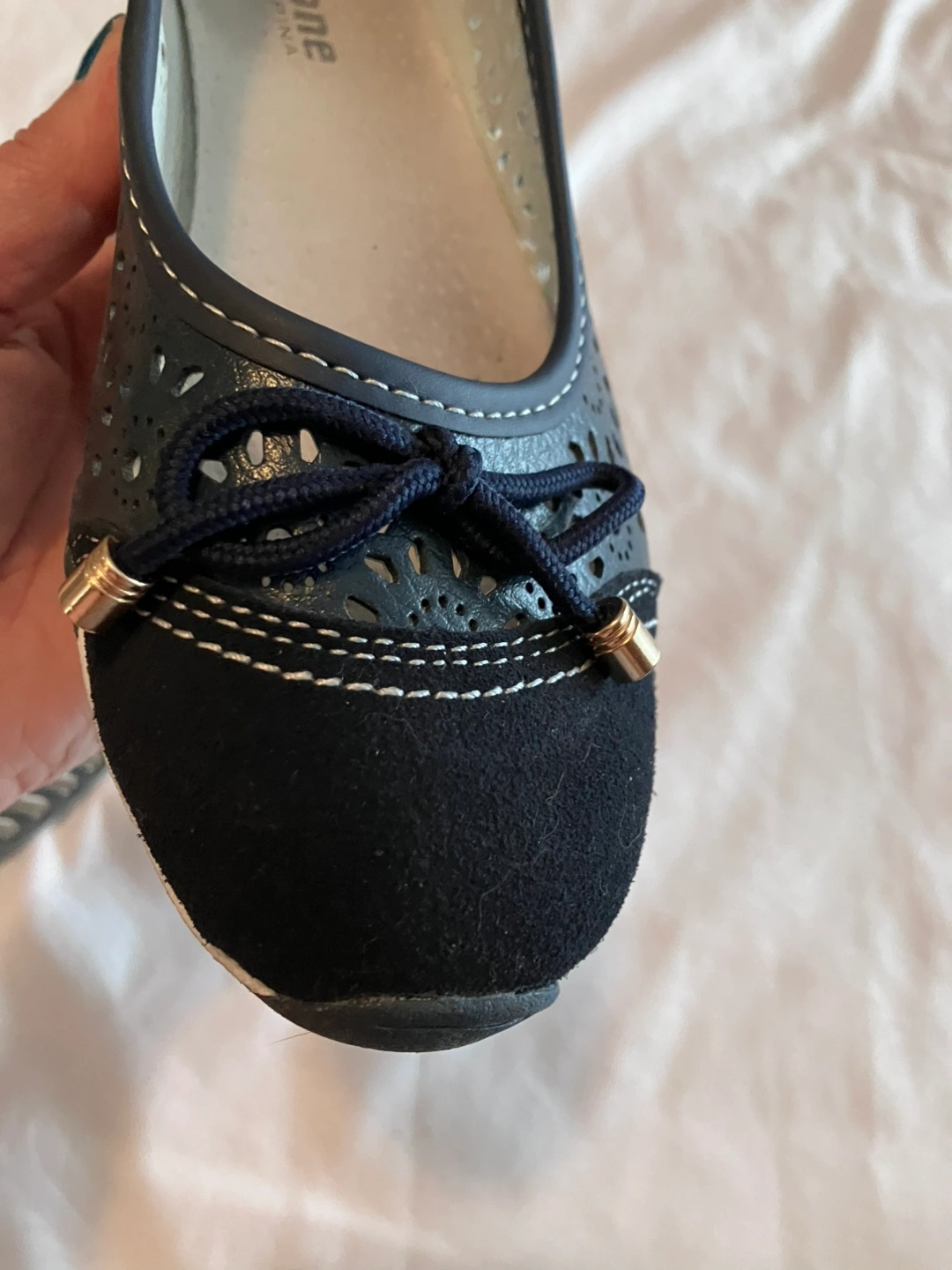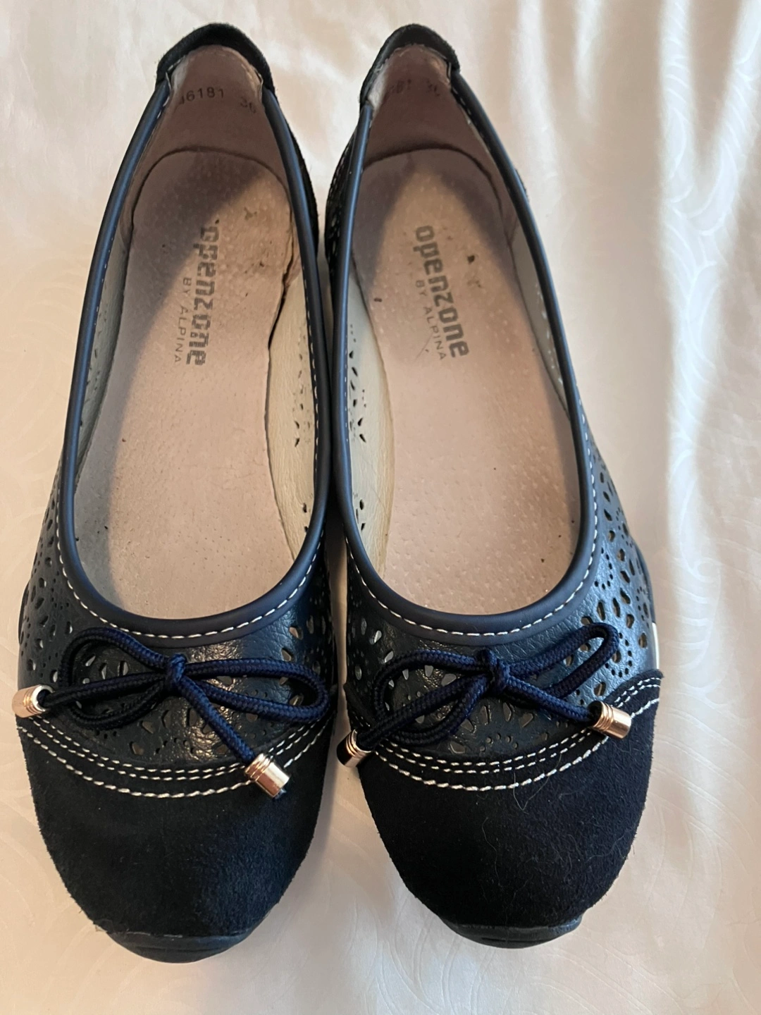 These lovely flats are navy blue, with floral cutouts. They have a suede-like toe and white stitching. The soles are a light beige colour. These flats are perfect for a relaxing day of errands.