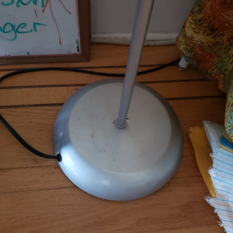 A tall floor lamp. Includes a round base and a long metallic pole. The lamp shade is a frosted white color. A great item for reading in the evenings.