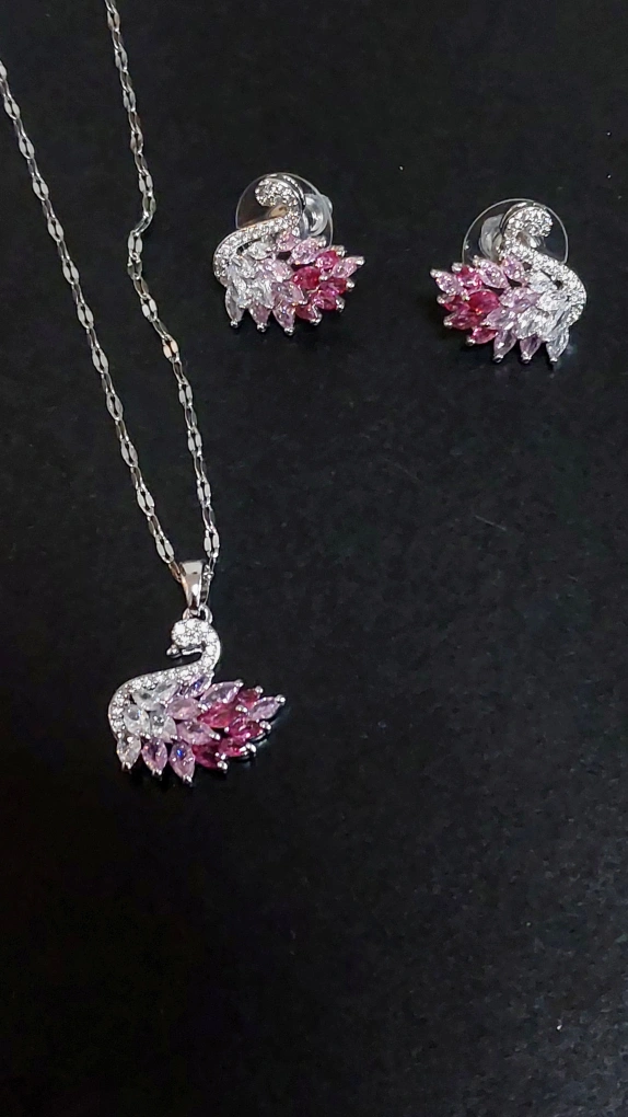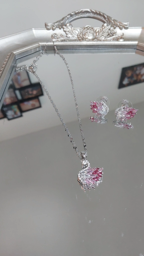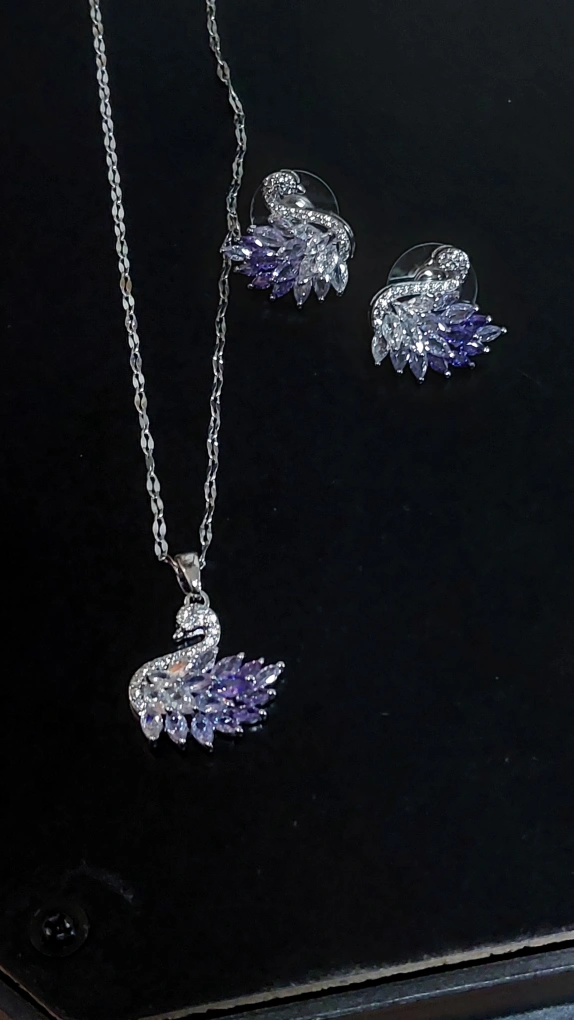3 colors avaliable. Each set of earrings & necklace 15CAD. Buy all 3 sets for 39CAD. Here is a beautiful necklace and earring set featuring a swan design. The necklace has a long chain, and the earrings are studs. The designs on both pieces are made from shiny zirconia stones and crystals. This set is perfect for adding a touch of elegance to any outfit.