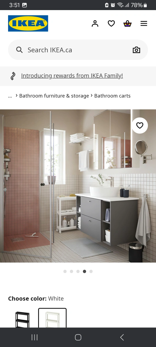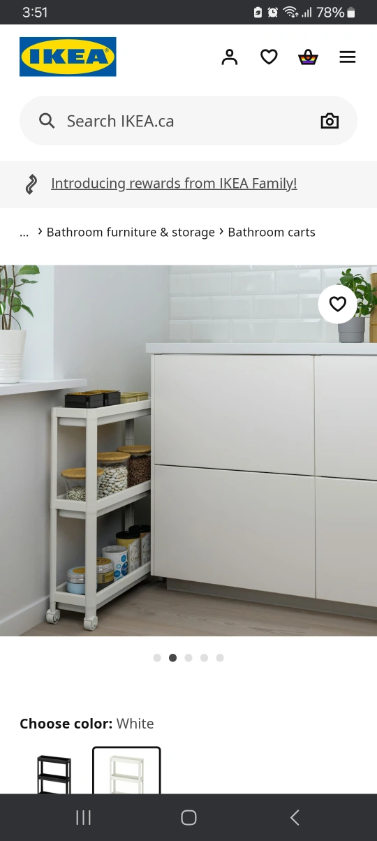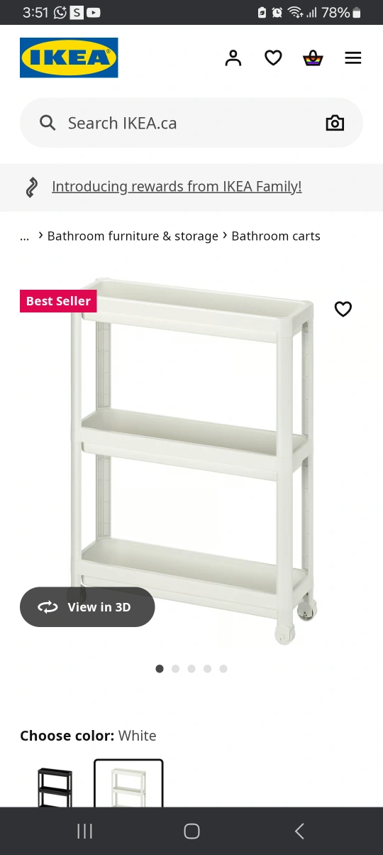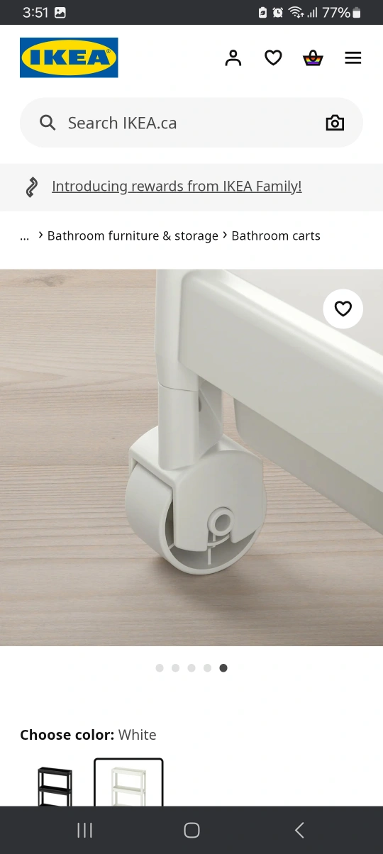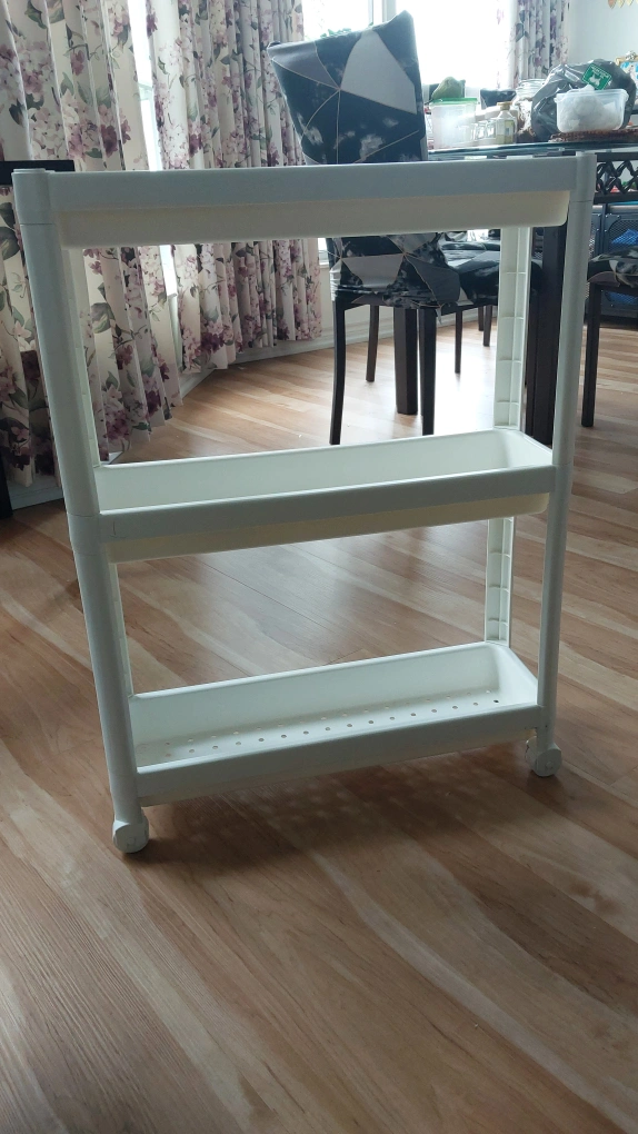 A white cart with three shelves. Each shelf has a lip around the edges. The cart is on wheels. You could use this cart for many uses around the home, such as a convenient spot for your morning essentials.