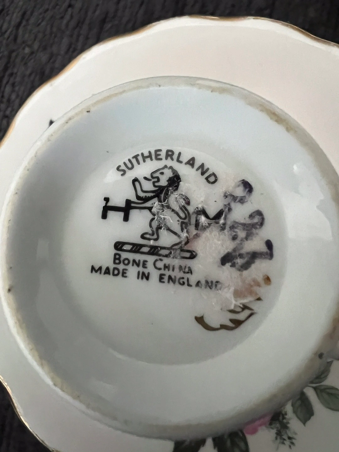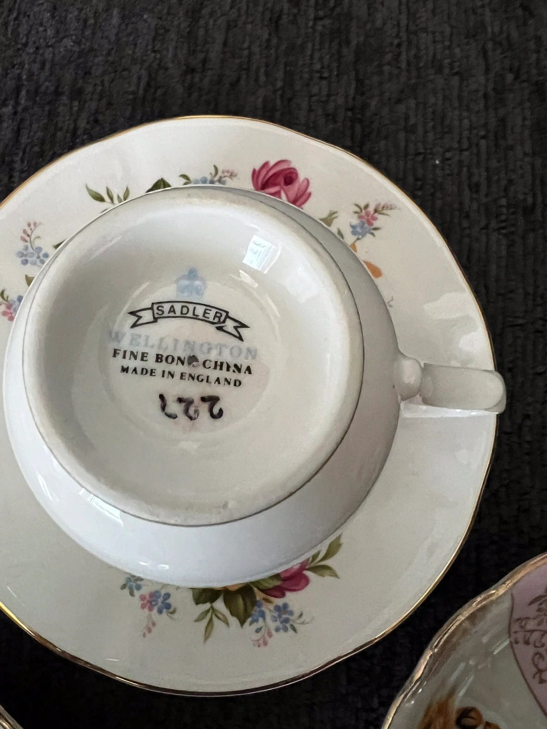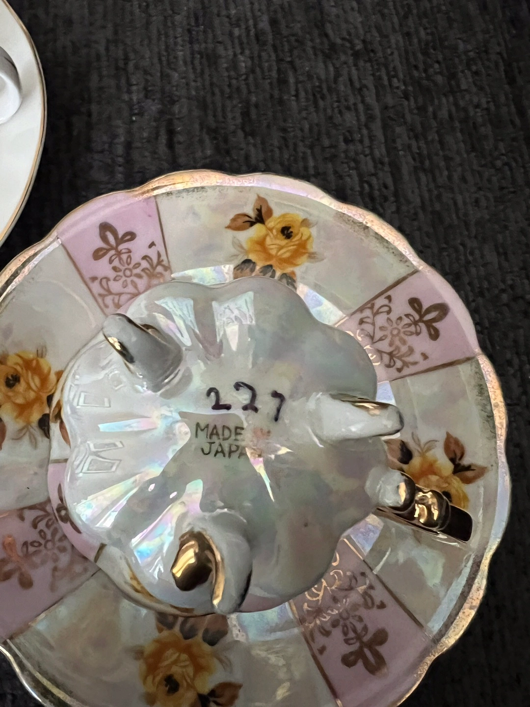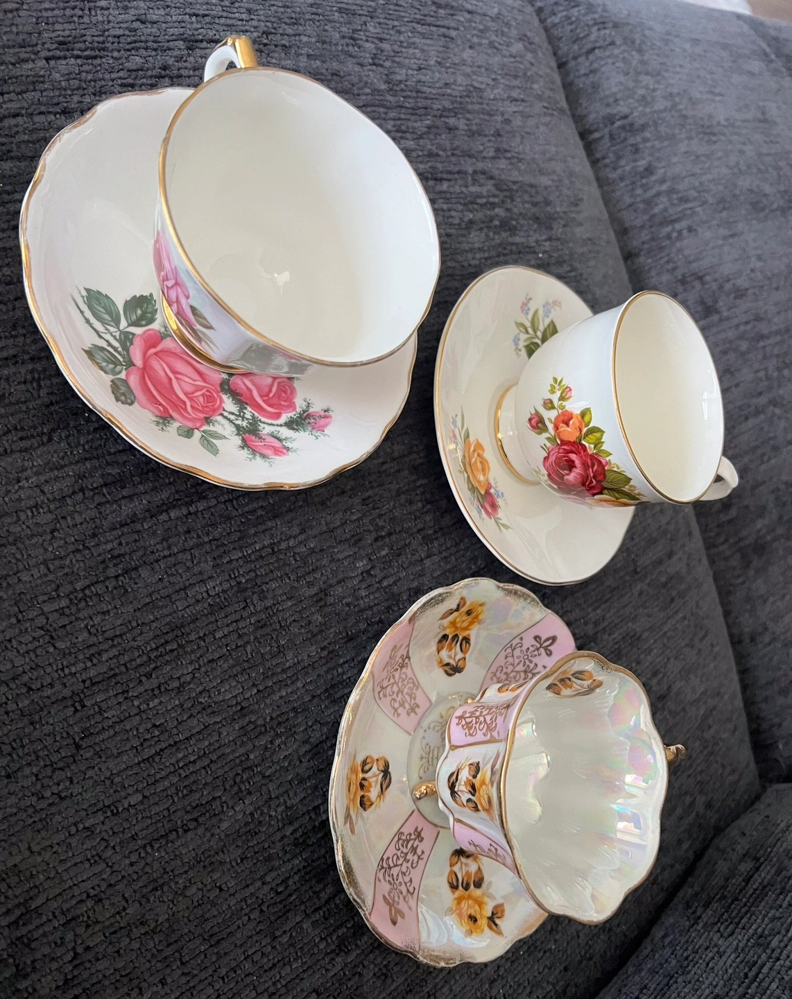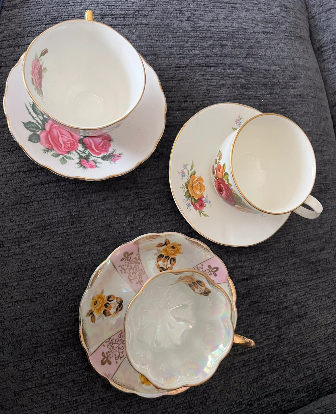 Featuring beautiful floral designs. Gold trim. One teacup has a unique iridescent finish and footed.Would look lovely with a nice warm drink, perhaps tea. Price is for all three
