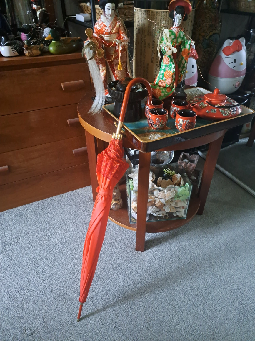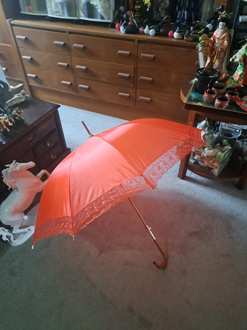 A beautiful orange umbrella. Features delicate lace trim. Curved handle and wooden details. Perfect for a relaxing walk in the rain.