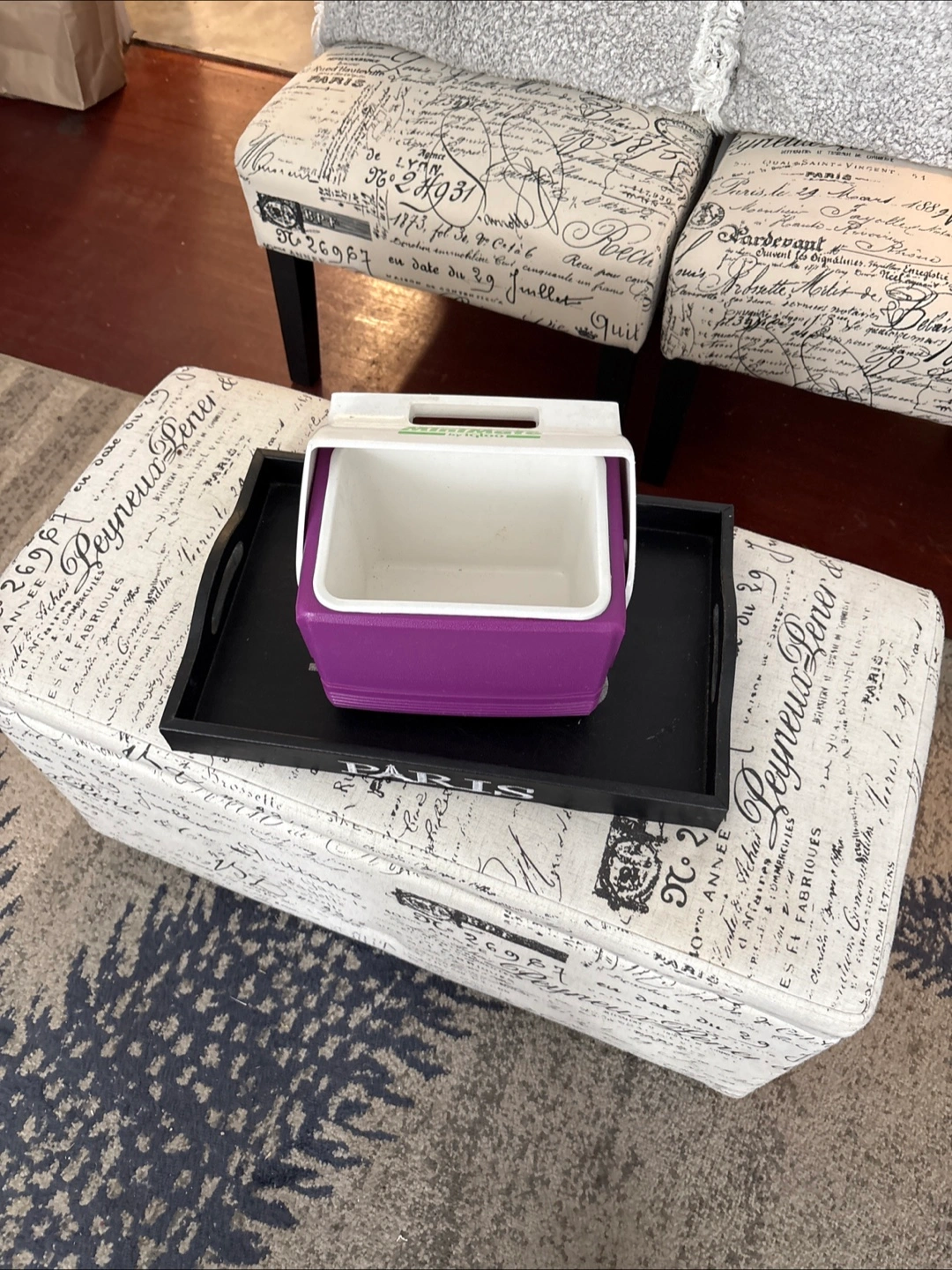 A purple and white cooler sitting on a black tray. The tray sits atop a decorative ottoman. The ottoman features script writing. Perhaps enjoy this cooler on a warm afternoon.
