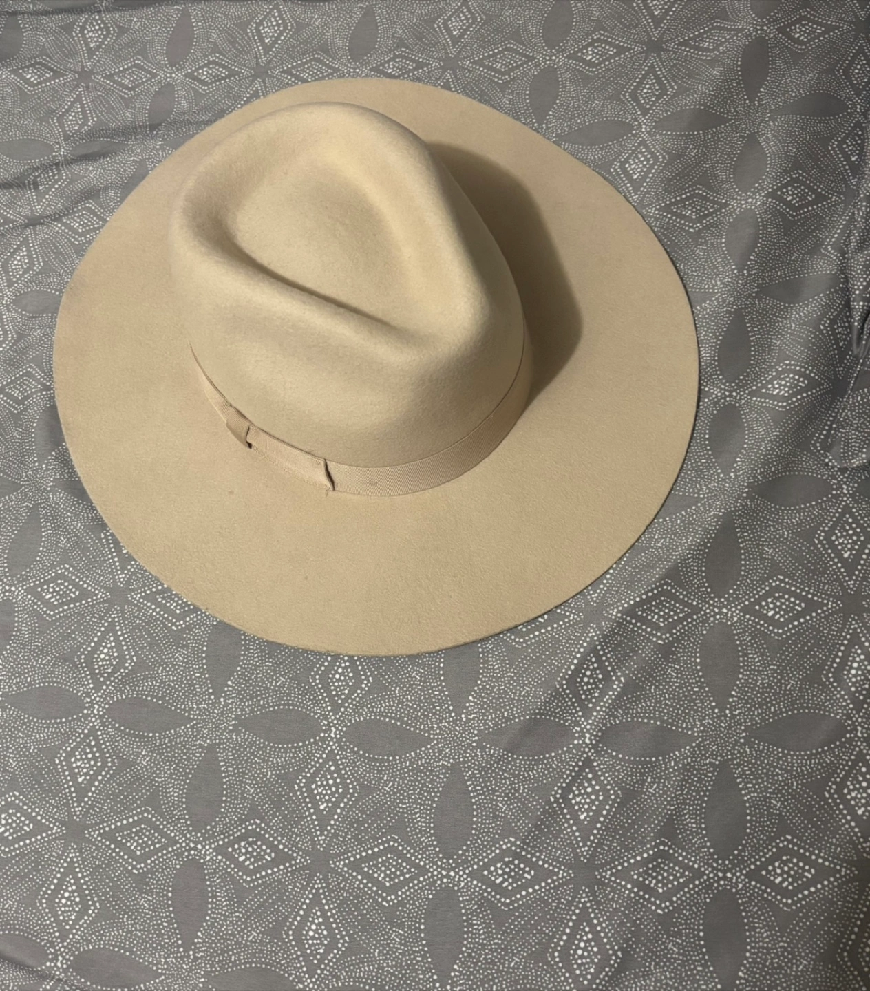 A beige fedora hat. The brim is wide. It has a band around the base of the crown. This hat is perfect for adding a touch of elegance to any outfit.