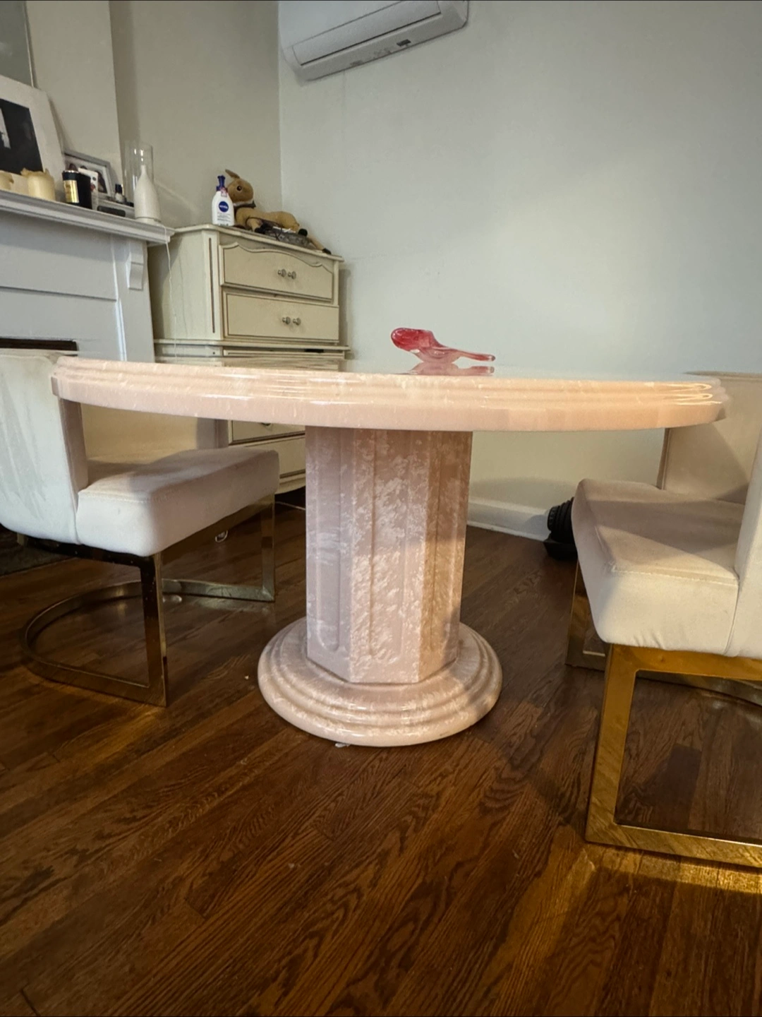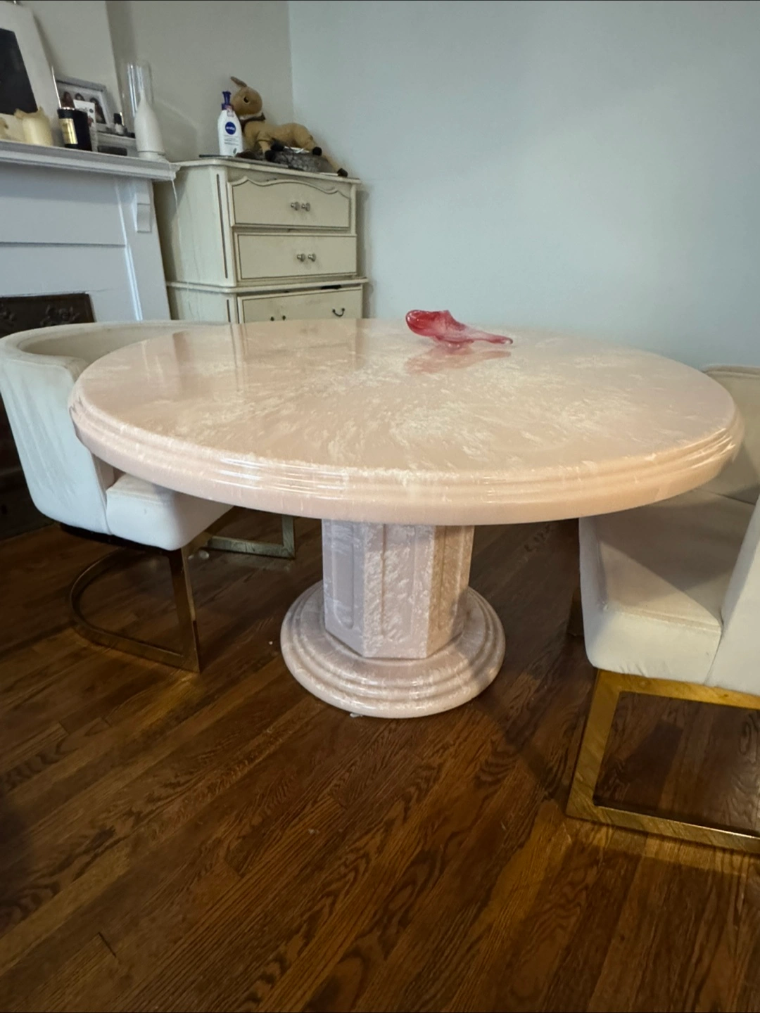 Vintage pink man made marble dining table in very good condition. 48” diameter and 28” height. Price negotiable. Pick up only in Yorkville. Top of table can be unscrewed from base and carried in pieces. Price negotiable.