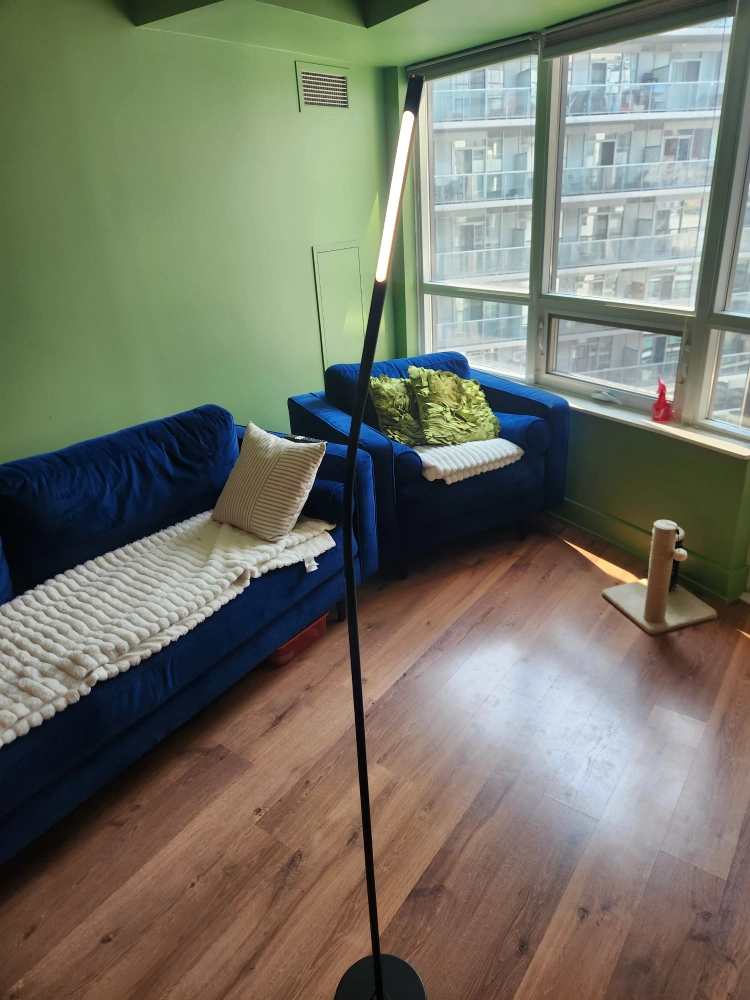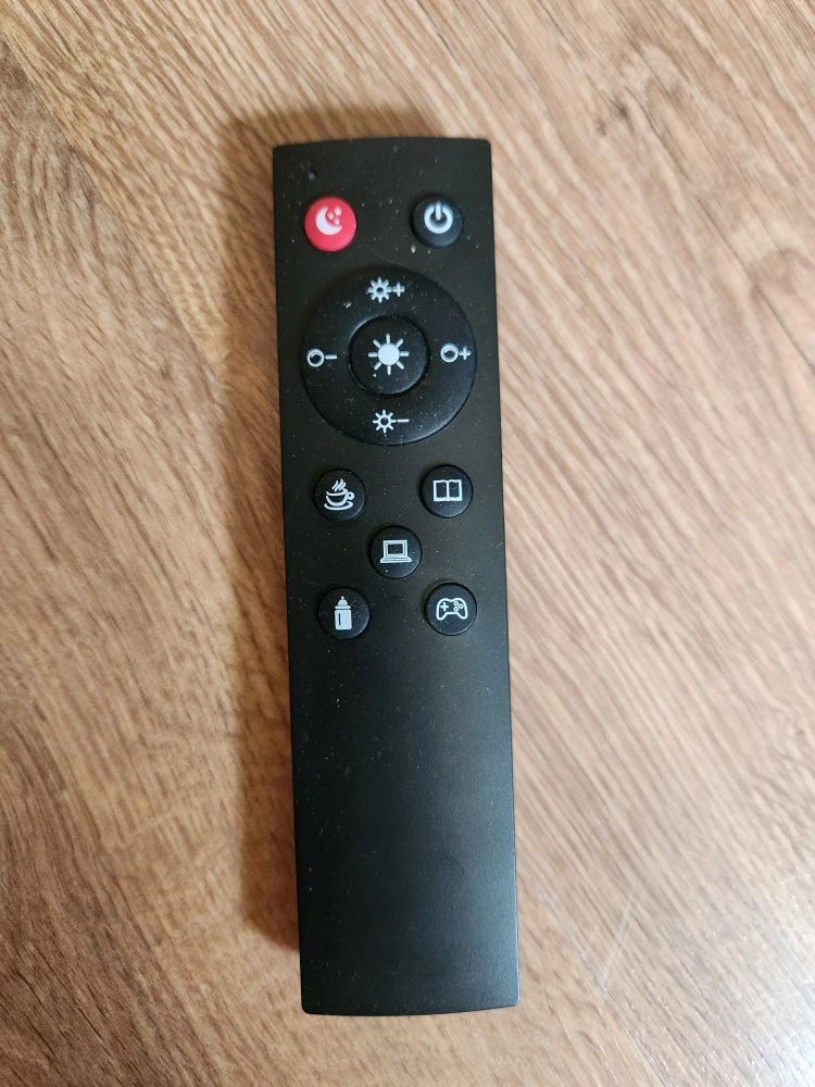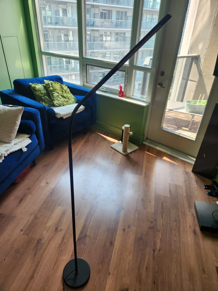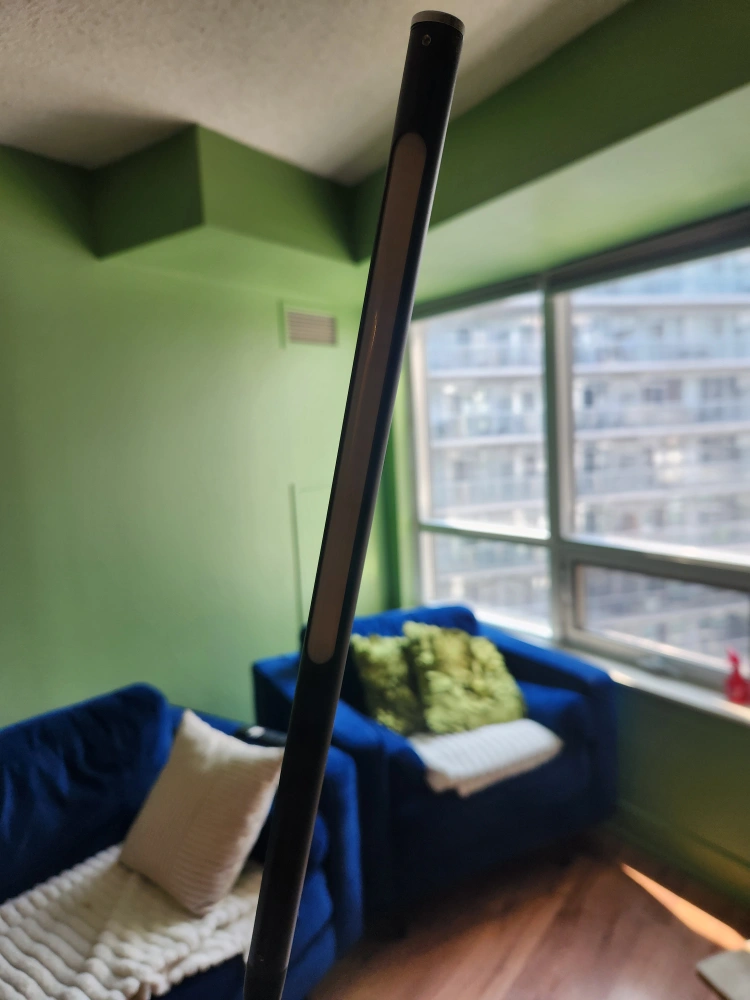 Black floor lamp, slender and elegant in design. The remote features various functions, including a night light, color, and brightness control.