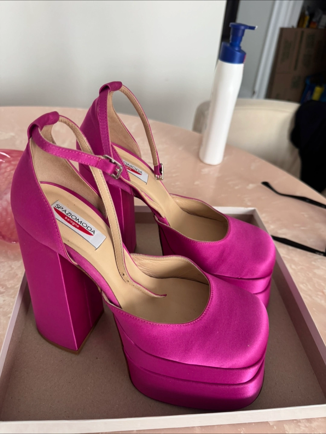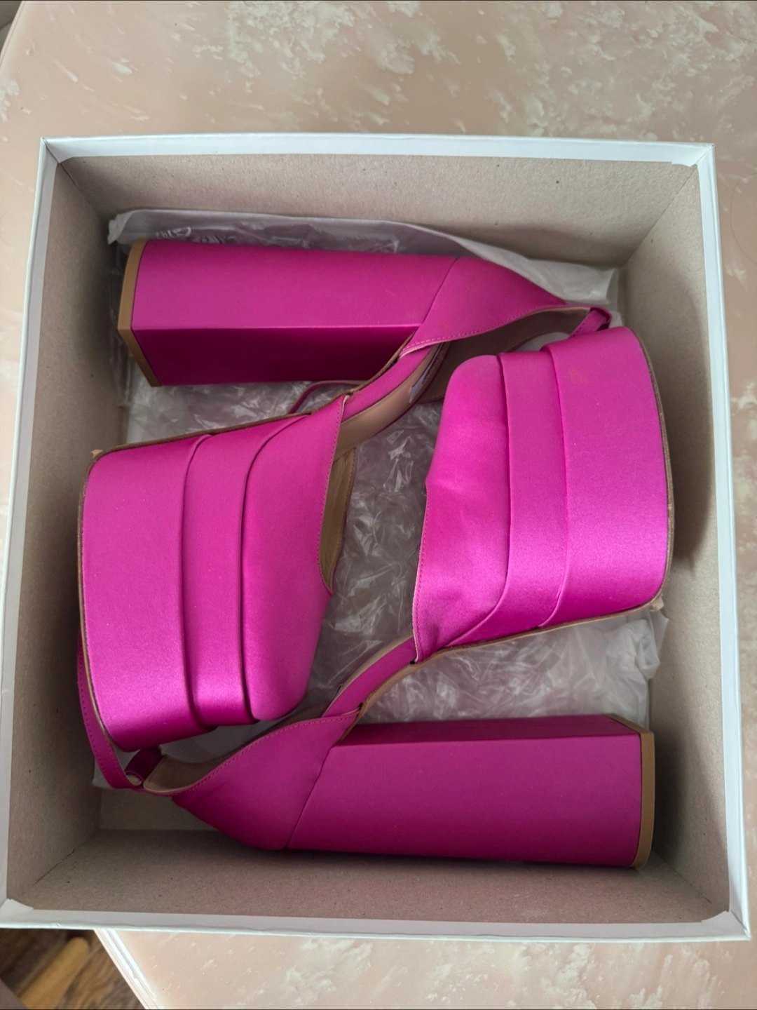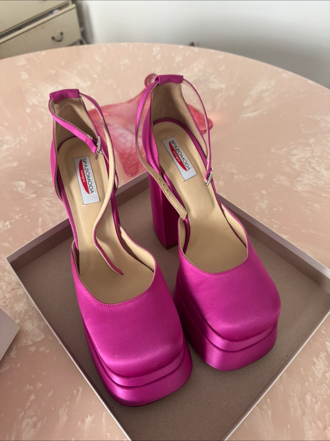 Bright fuschia platform heels. Features a block heel and strap that goes around the ankle. Similar design to Versace style platforms. Worn once or twice. Original price was $500.