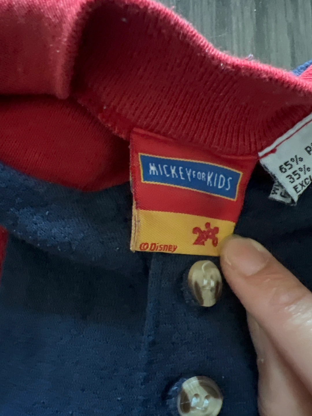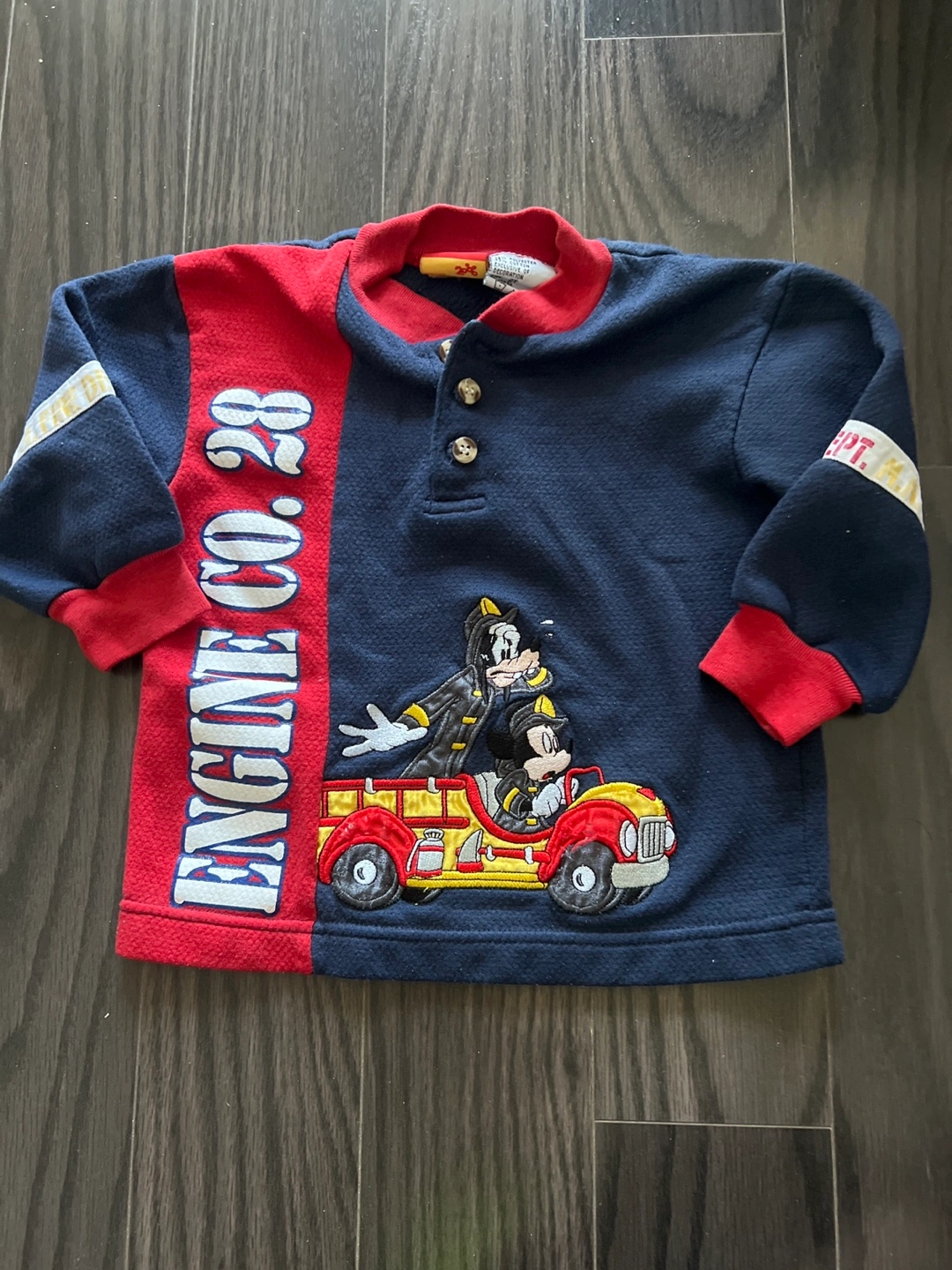A long-sleeved sweatshirt. Features a firetruck design with Mickey Mouse. Red and blue color scheme with button-down closure. Perfect for keeping warm on those chilly days.