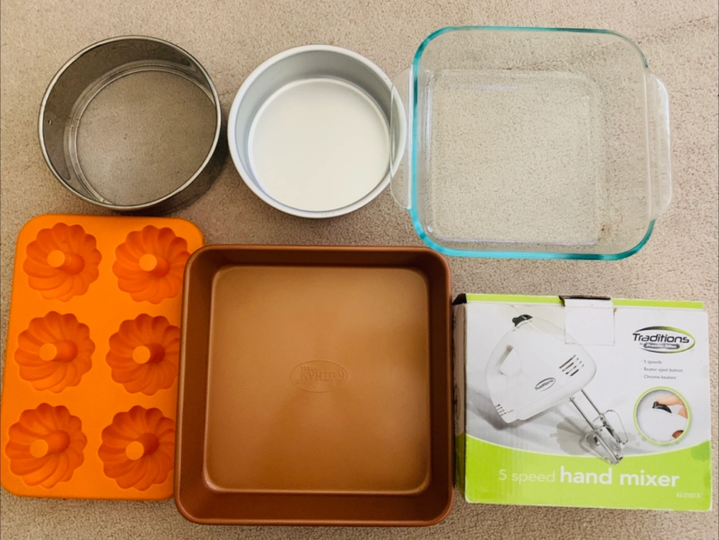 Collection of baking pans, a muffin mold, and a Traditions hand mixer. Lightly used and well cared for. A great bundle for anyone looking to stock their kitchen or upgrade their bakeware. Pick up only ( vancouver downtown) Cash only