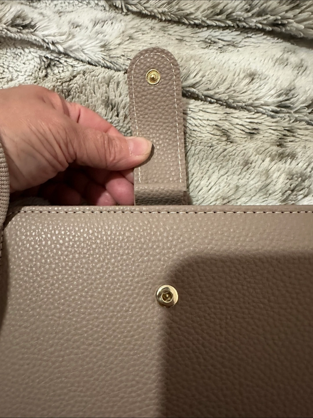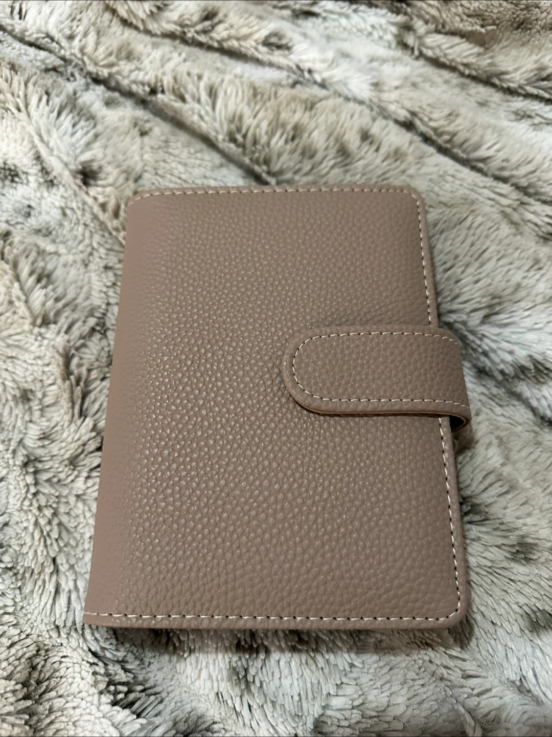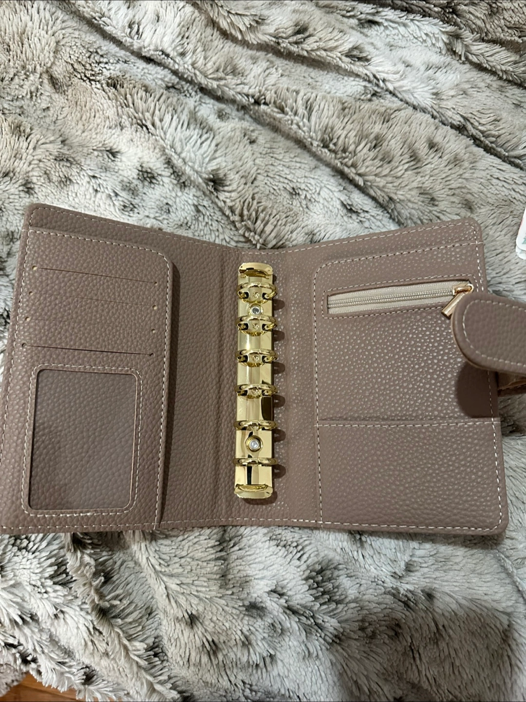 A taupe coloured A7 planner binder. The binder has a snap closure. There's a gold ring binder inside. A great way to keep your notes organized and in one place, ready for easy access, card slots, money slots and a change compartment. Brand new, mint condition. Smoke free home.