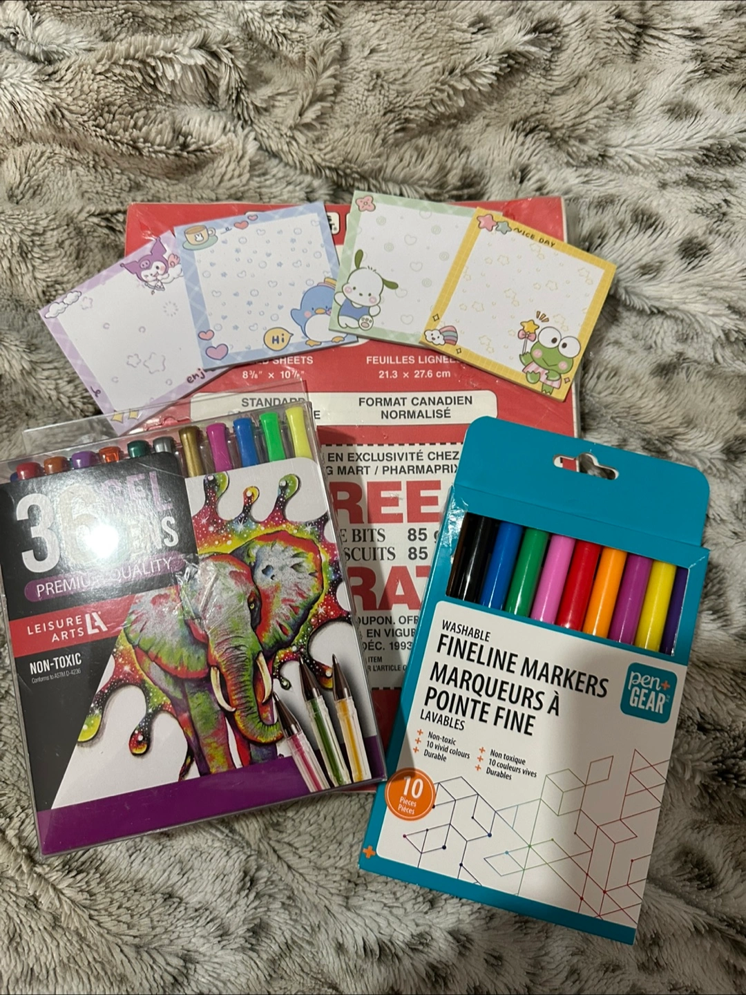 Included are various colours, 10 pack of washable markers, 36 coloured gel pens one missing pen so there are 35 pens, and notepads, 400 sheets ruled paper. The notepads have cute character designs. You can write your thoughts on the stationary to free your mind. Smoke free home