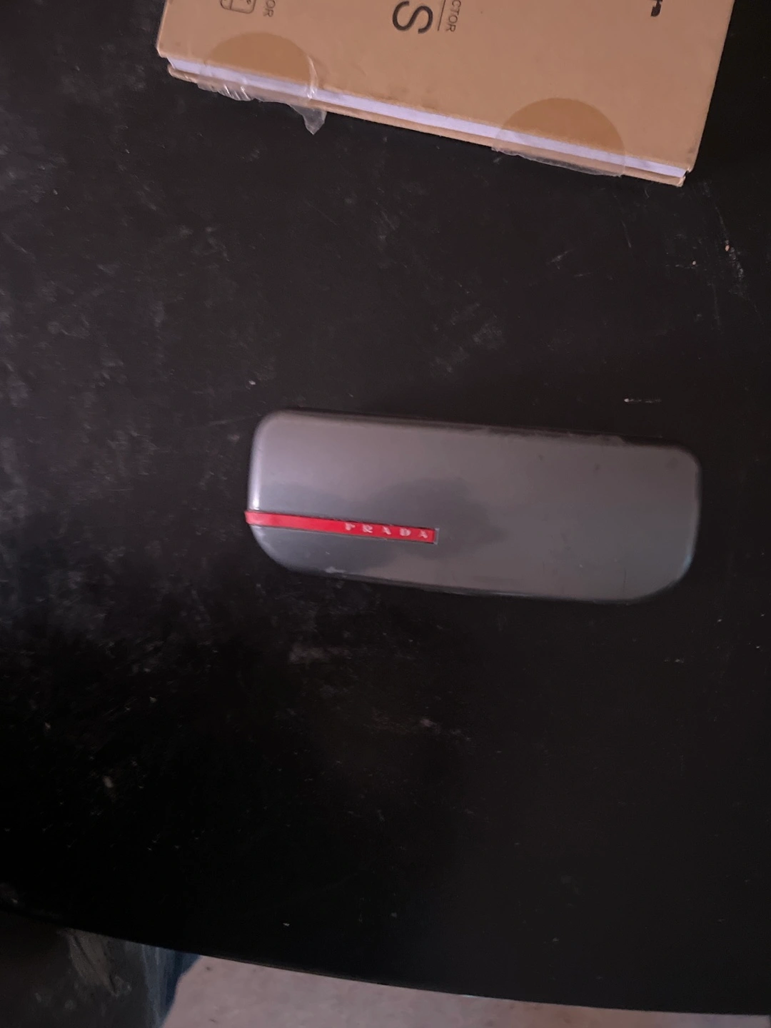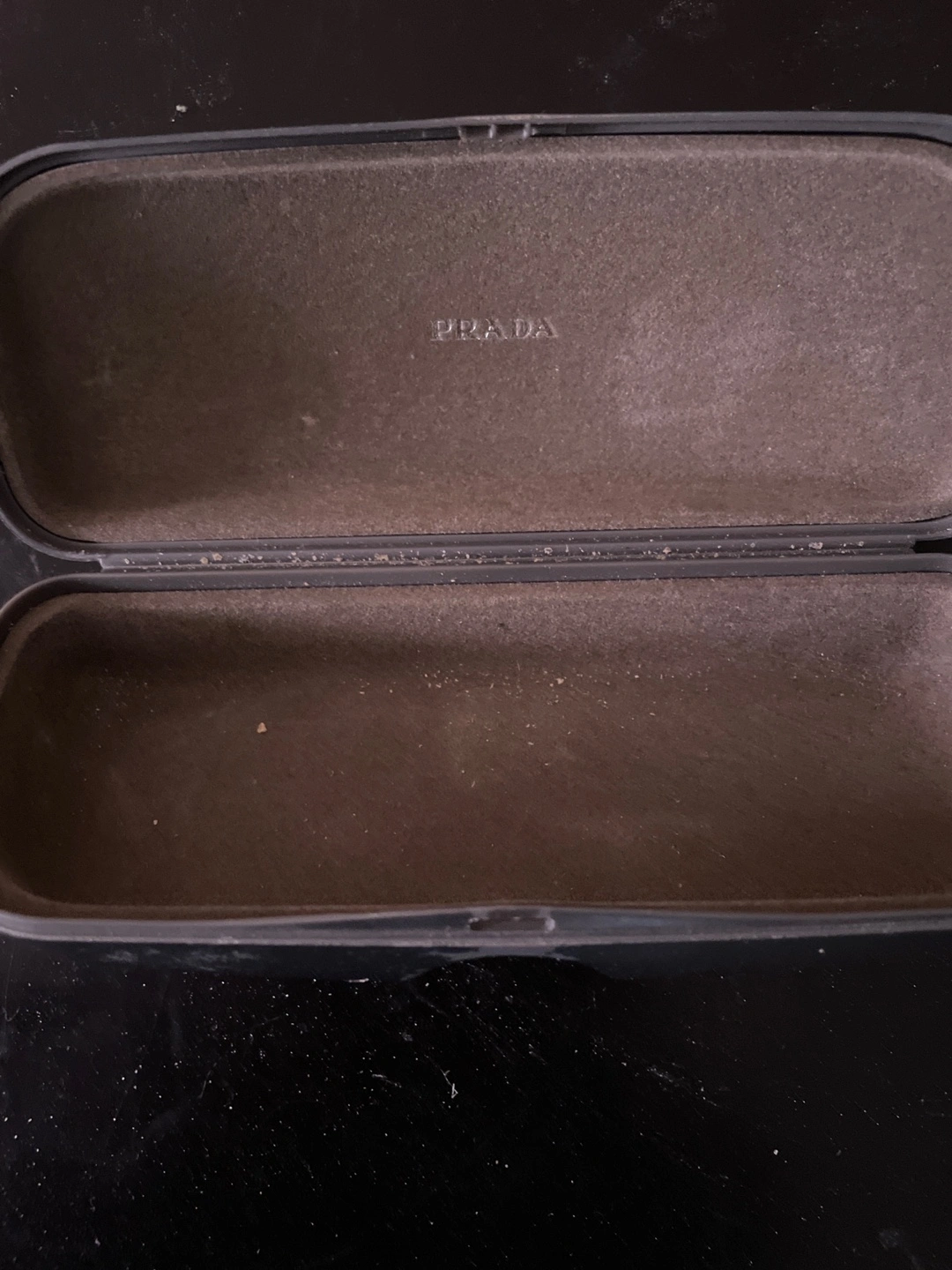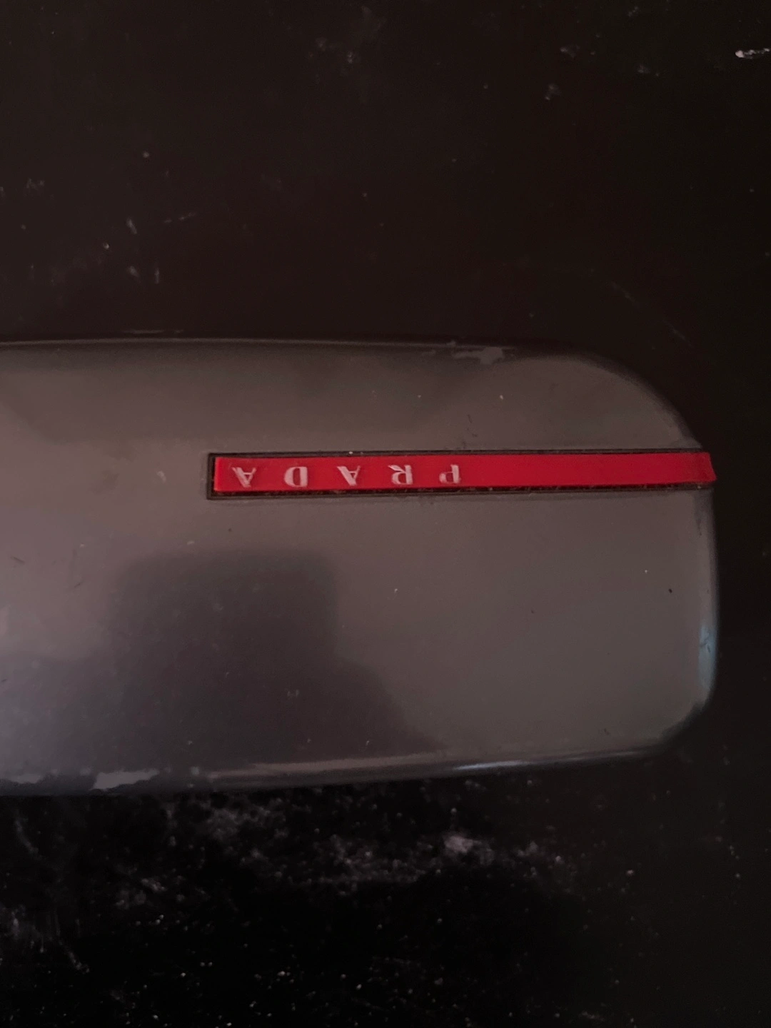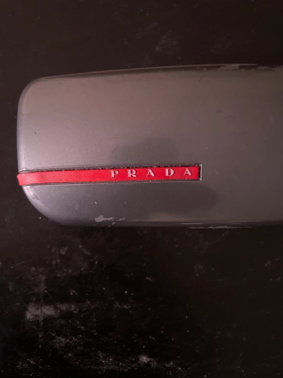 A gray, rectangular case. Has a red stripe with the brand name. Opens to reveal a soft, brown interior. Store your precious eyewear safely.